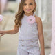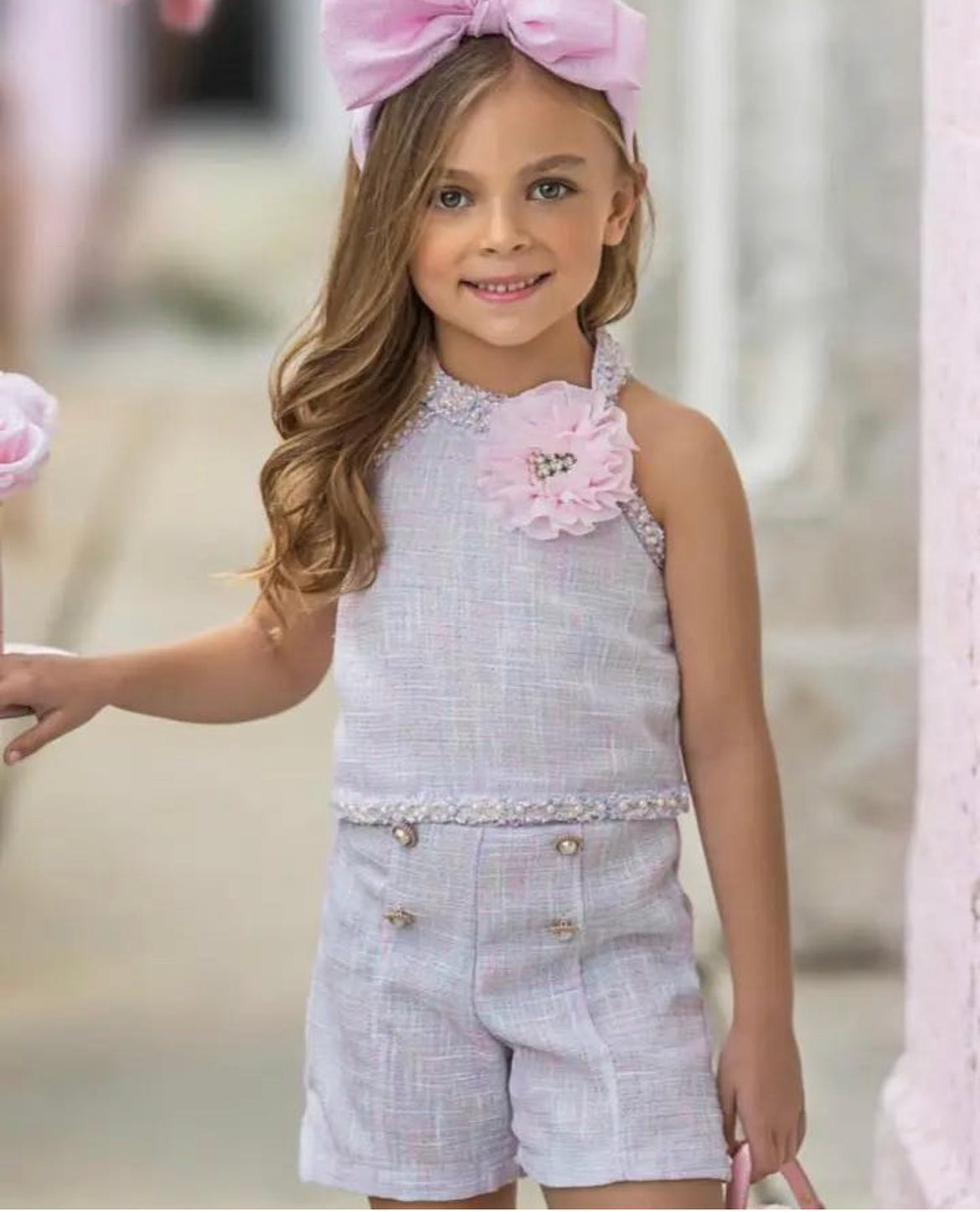* Set includes pastel-colored halter tweed top with white trim and matching shorts with white trim and pearl button details * Cute and confident vibes are guaranteed with our pastel halter tweed top and short set. She'll feel springtime magic when she sees its pretty color, rosette detail, and pearly bling. Snap endless pics because she'll be looking photo-ready! * Lightweight fabric and halter design keep her cool and comfy even through active days. * Designed with versatile style for maximum wear. Pair with her other fave pieces and create endless looks. * Perfect for spring, casual outings, parties, fashion photoshoots, and year-round fun