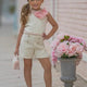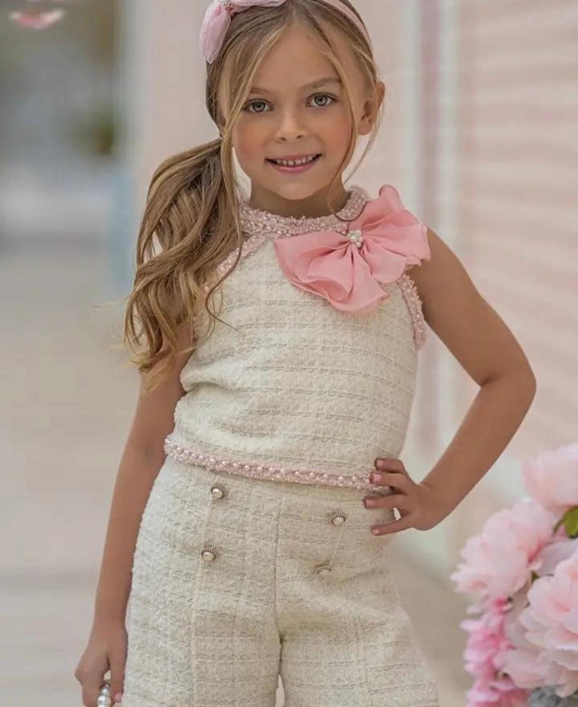 Elevate your little one’s wardrobe with our Chic Tweed Set , a sophisticated and fashionable ensemble perfect for any stylish occasion. This set features a beautifully tailored sleeveless top paired with matching high-waisted shorts, both crafted from elegant tweed fabric. The outfit is accented with delicate pearl details and a statement bow at the neckline, adding a touch of femininity and charm.