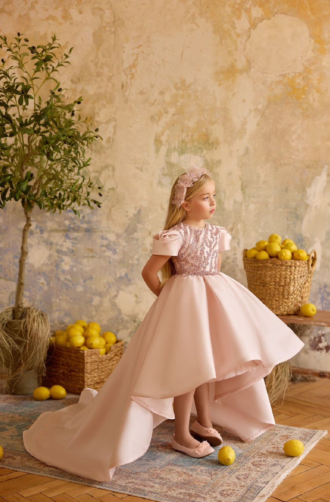 Step into elegance with The Ismeria Gown, a captivating masterpiece that blends timeless sophistication with modern charm. Designed in both floor-length grandeur and a playful high-low silhouette, this gown allows your princess to shine in any setting.
