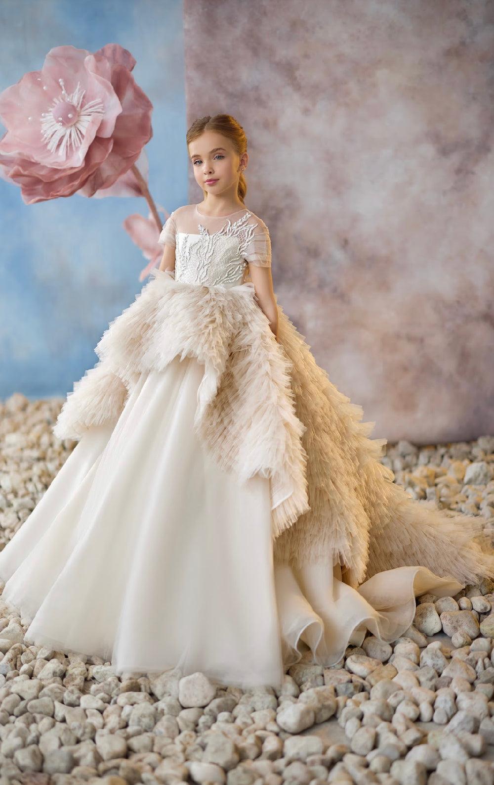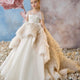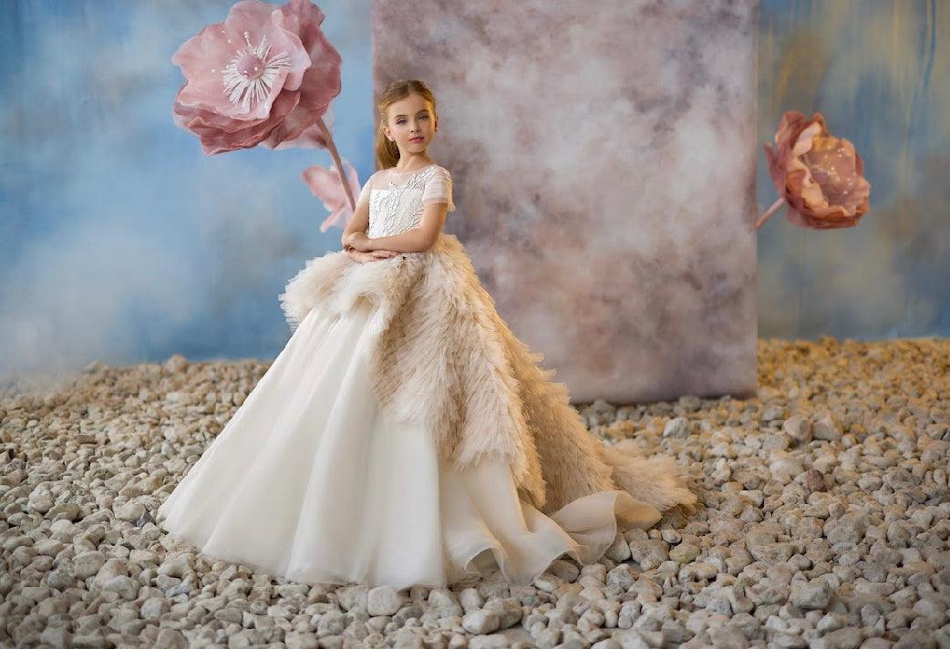 - Color & Embellishments: The gown comes in an elegant cappuccino shade, with the feathers adding a subtle contrast in texture. The bodice is embellished with lace detailing that extends to the shoulders, adding a touch of vintage-inspired charm. The back of the gown features an illusion neckline with lace accents, offering a romantic and refined finish.
