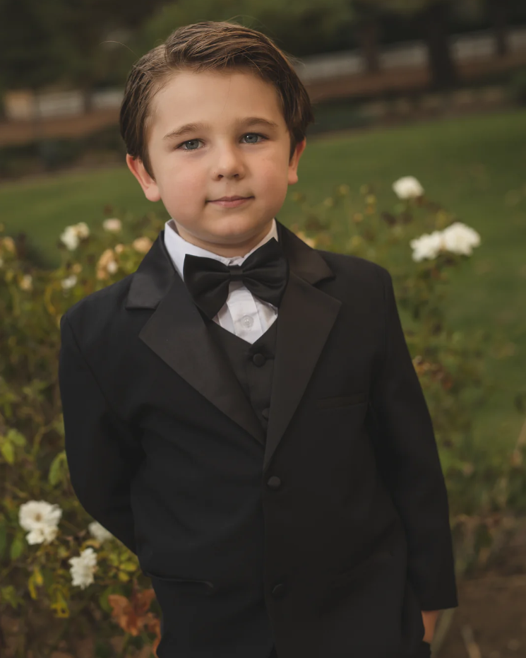 Every young gentleman deserves a look that’s timeless, polished, and powerful—and The Bond Black Tuxedo delivers just that. With its crisp tailoring and signature black satin accents, this suave ensemble channels the charm of a classic secret agent with the ease of all-day comfort.