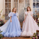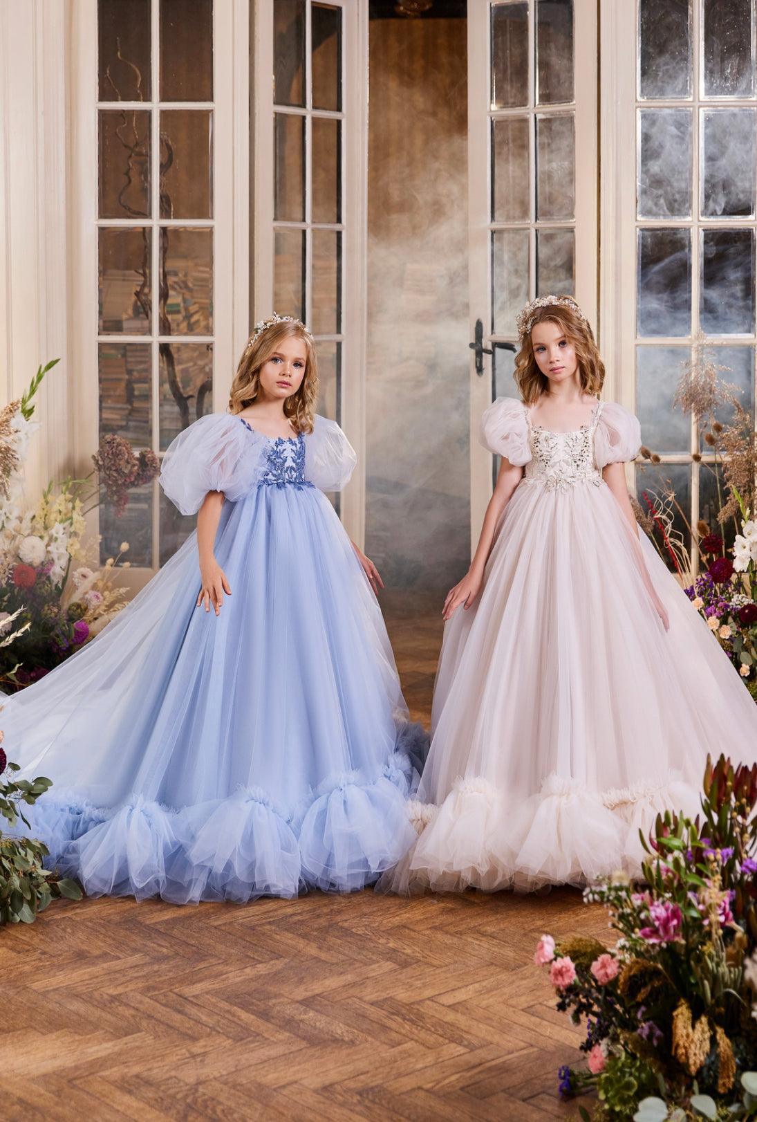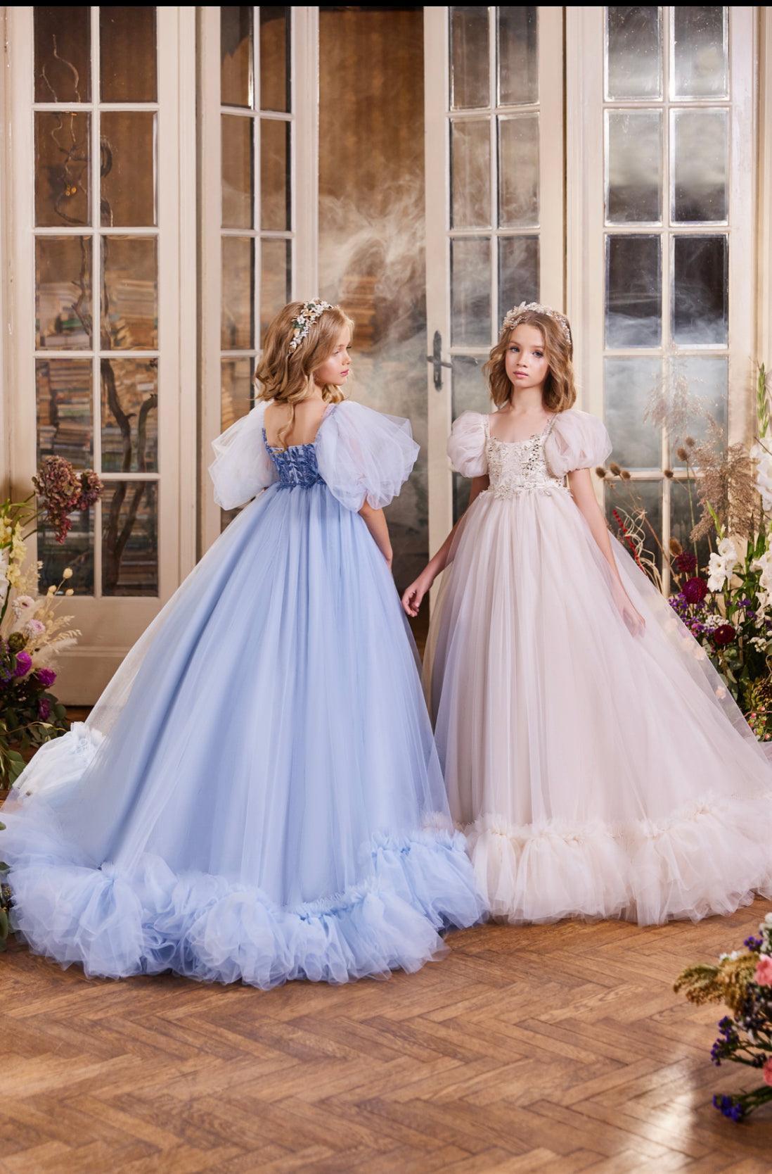 Wonderful dress made of many layers of airy tulle with floral décor! The corset is decorated with original lace with beads and sequins. Very puffy sleeves-lanterns - a fashionable hit of the season! The long fluffy skirt is decorated with a wide ruffle along the hem of the dress. A small train makes the dress royal. The back fastens with a long zipper. The dress can be ordered in different colors.