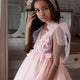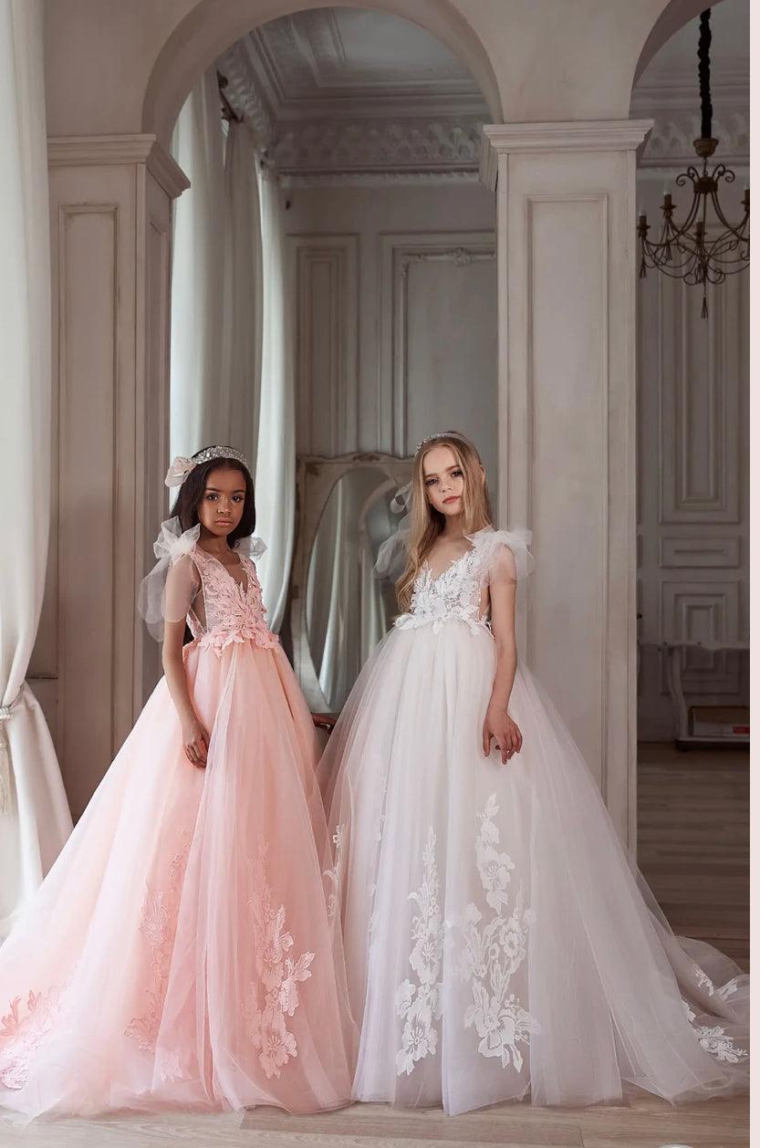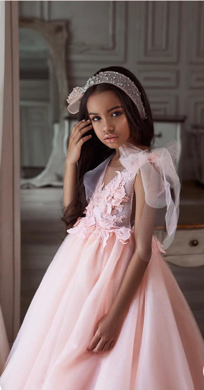 With this stunning pink floor-sweeping flower girls' dress, what an adorable princess look your daughter can get! Look at these shoulders adorned with lightweight bow-ties made of sheer net and stunning dimensional floral appliques on the bodice and skirt. An exquisite ball gown skirt, supported by multiple layers of the most delicate net, completes the designer's style for the big day.