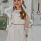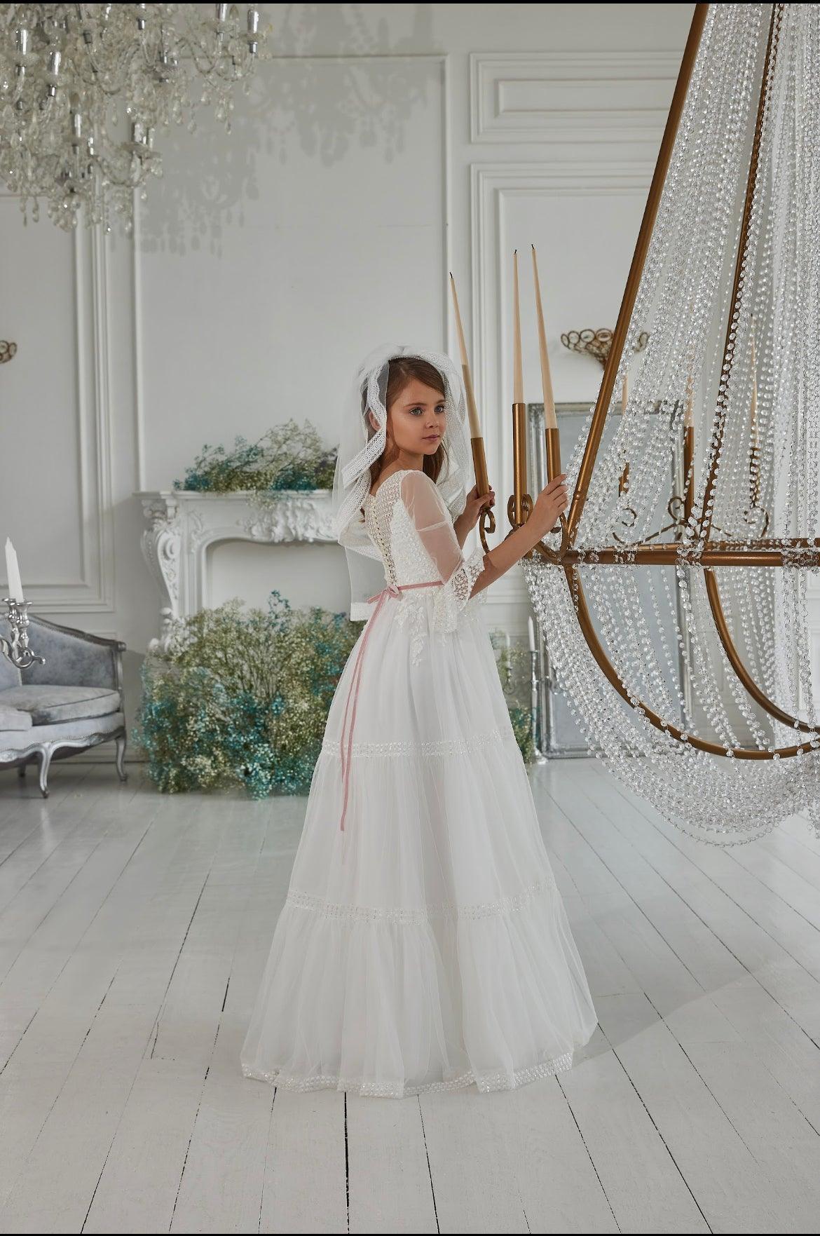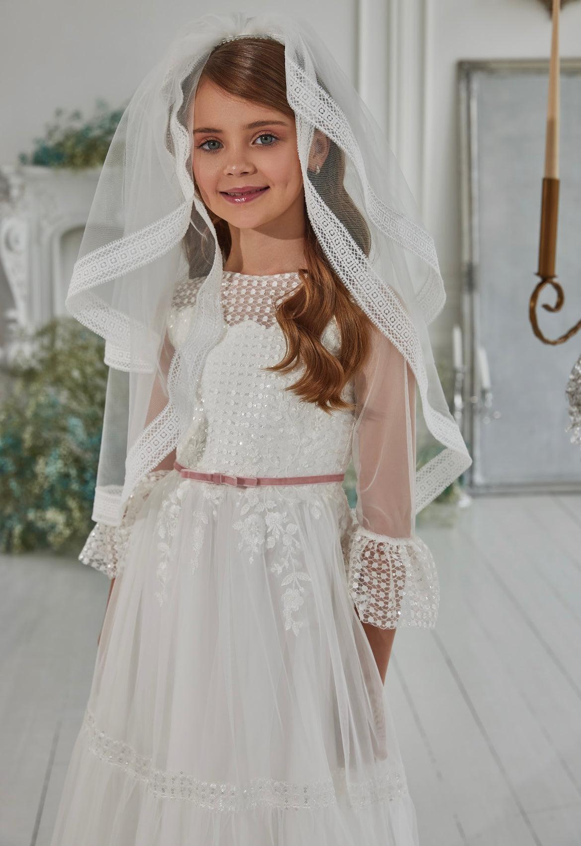 Consider a simple yet elegant silhouette for her Communion dress. This white tulle dress is so adorable! The dress's bodice featuring sheer bell sleeves is touched with delicate lace on the front and back. The sleeves are trimmed with matching lace. The same lace creates a 3-tier effect on the skirt. Sequins and beads embroidery shimmer on the top, while a pink ribbon sash accentuates the waist.