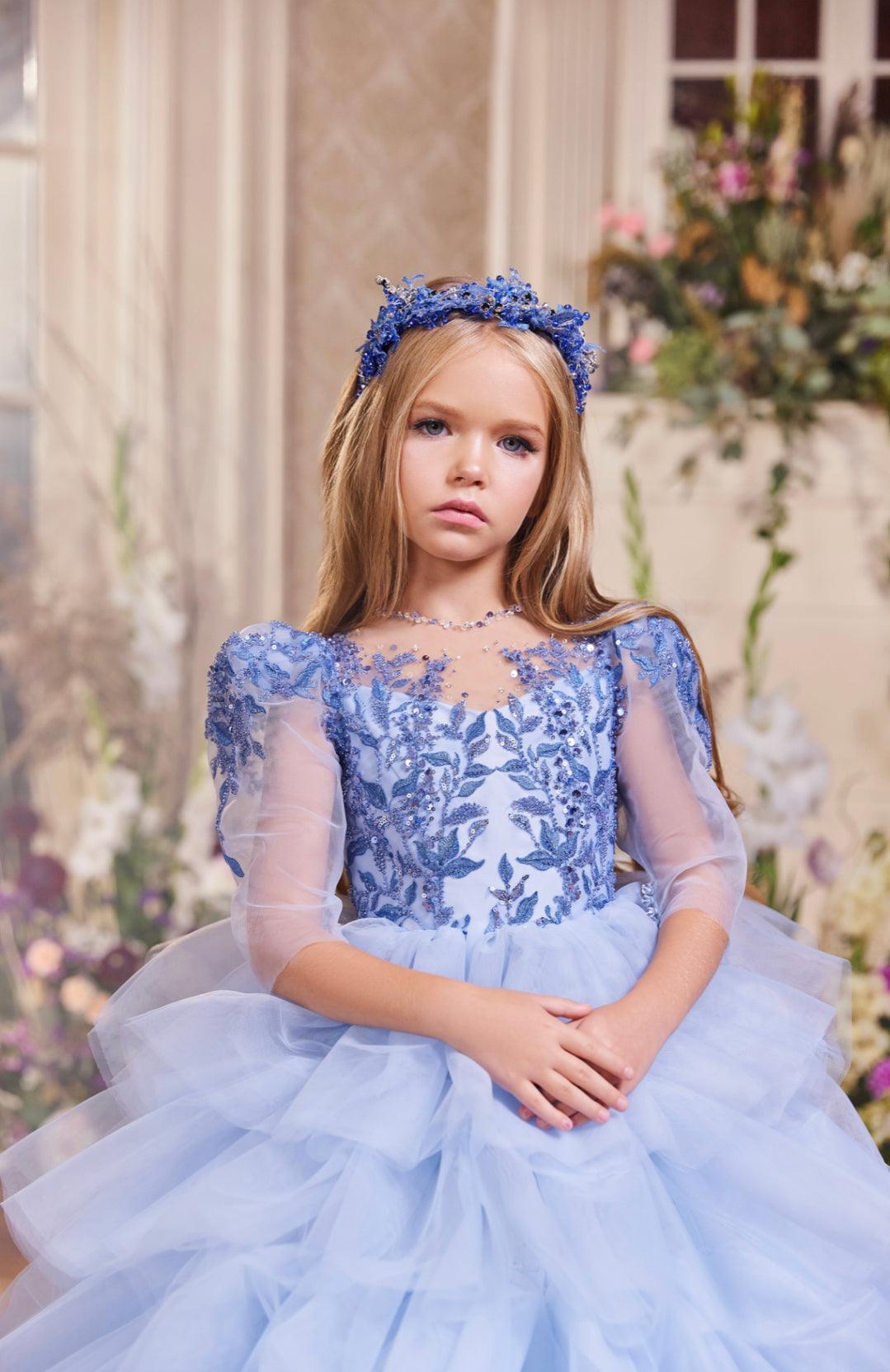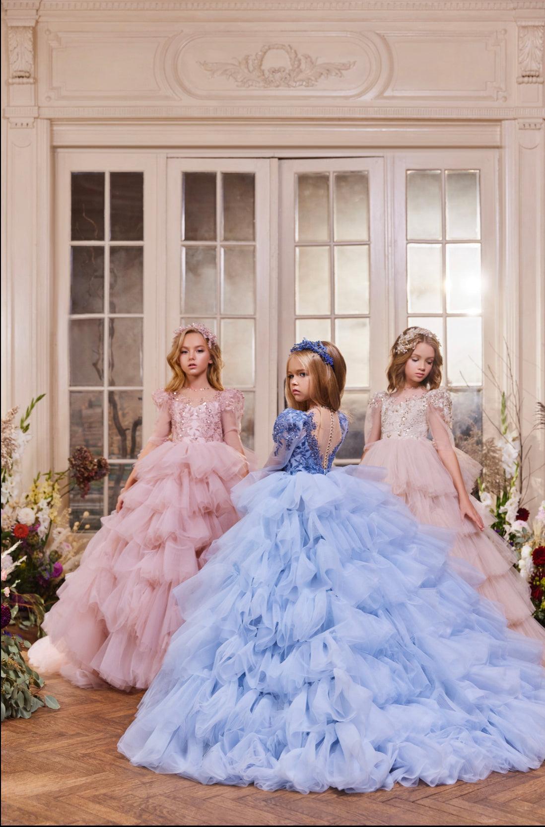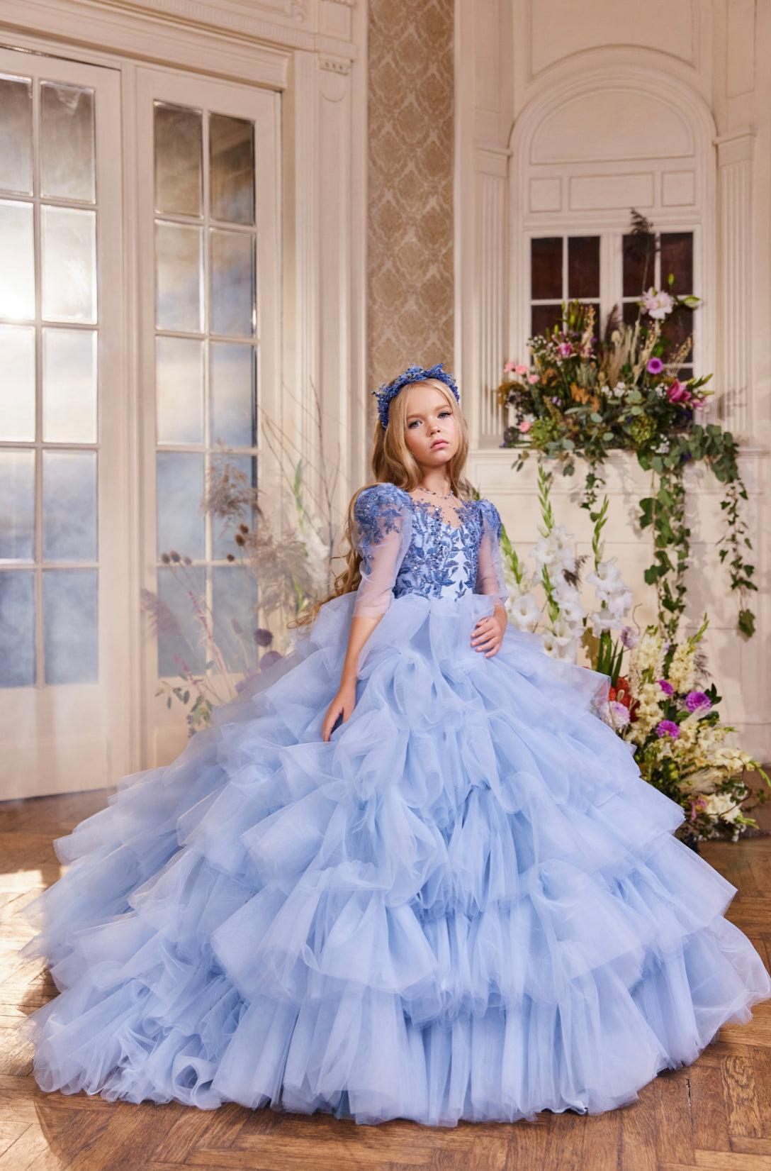 Step into a world of fairy-tale elegance with our Princess Couture Gown, available in stunning shades of pink, blue, and cappuccino. This exquisite gown features a breathtaking multi-tiered ruffled skirt that flows with regal grace, perfect for any formal occasion. The fitted bodice is adorned with intricate lace details, soft tulle layers, and delicate embellishments, making your little princess the center of attention.
