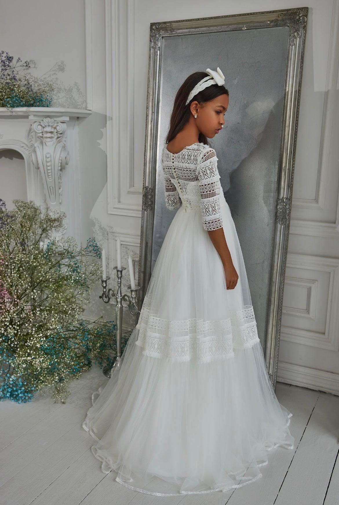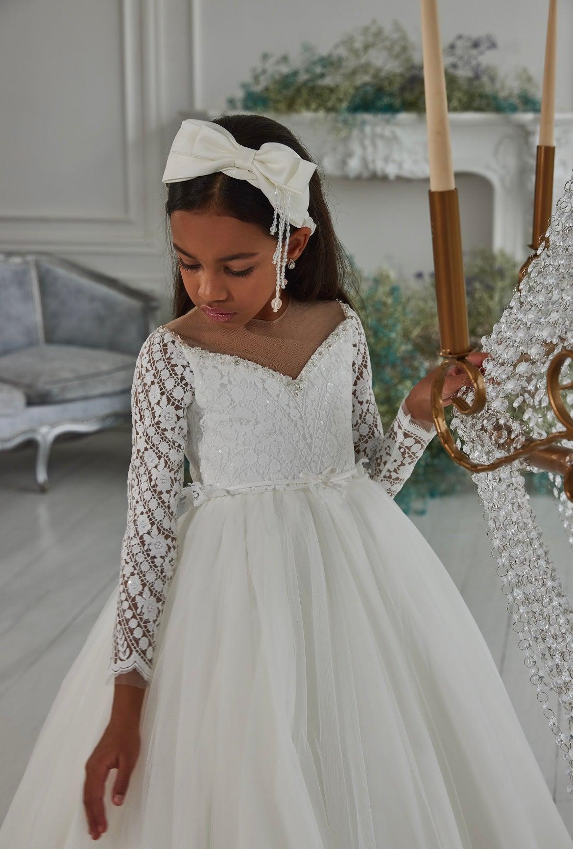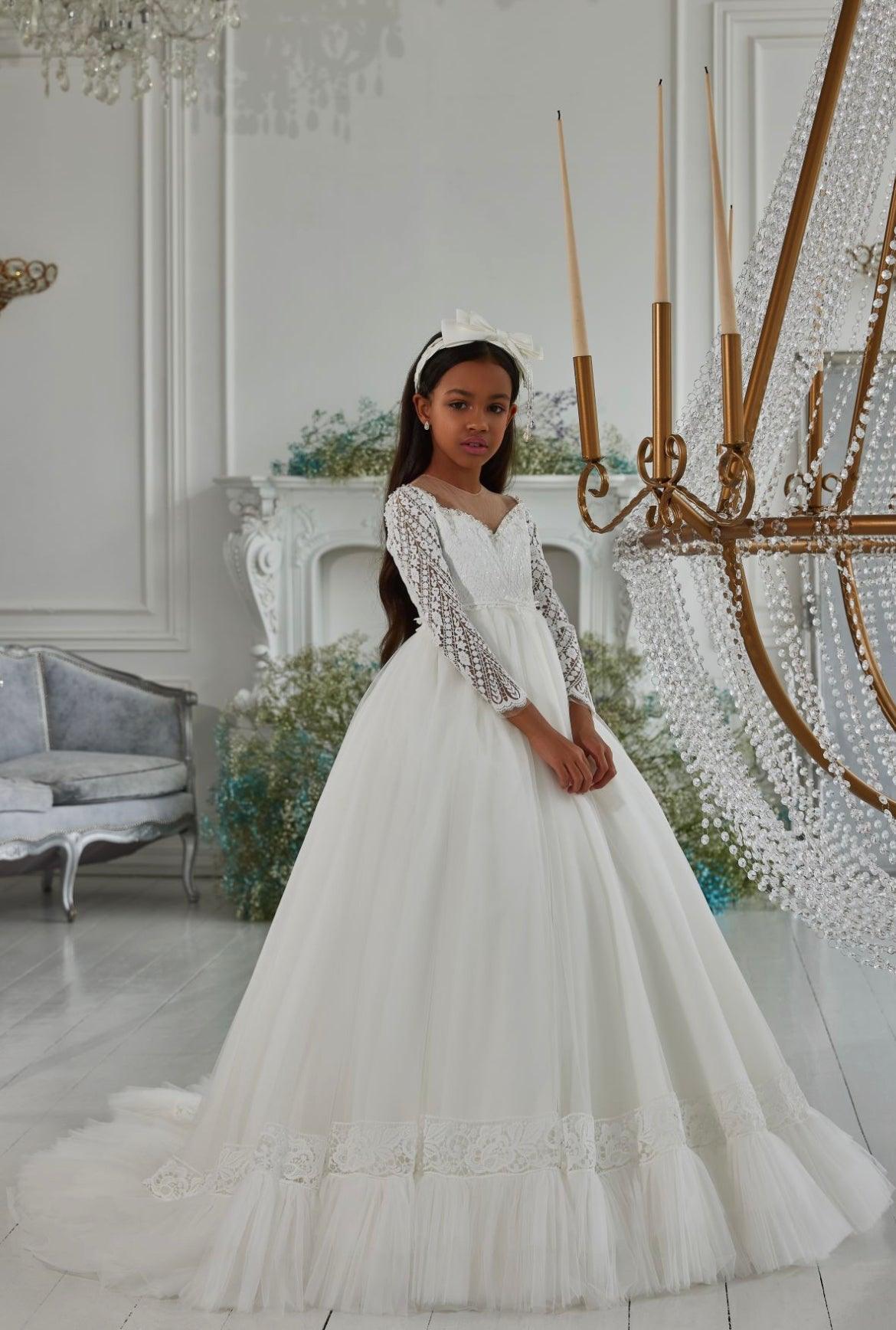 Unbelievably adorable white dress with long sleeves, suitable for Holy Communion. Designed with delicate lace sleeves and a ruffled hemline on the skirt, this princess-like white dress is perfect for special occasions. The illusion back is decorated with a row of buttons for a finishing touch. Pair it with a matching veil for an elegant ensemble.