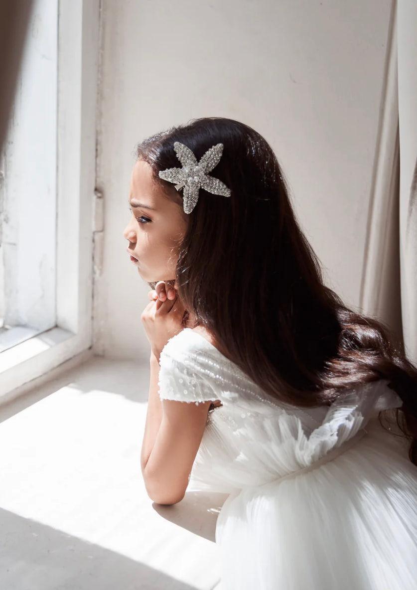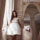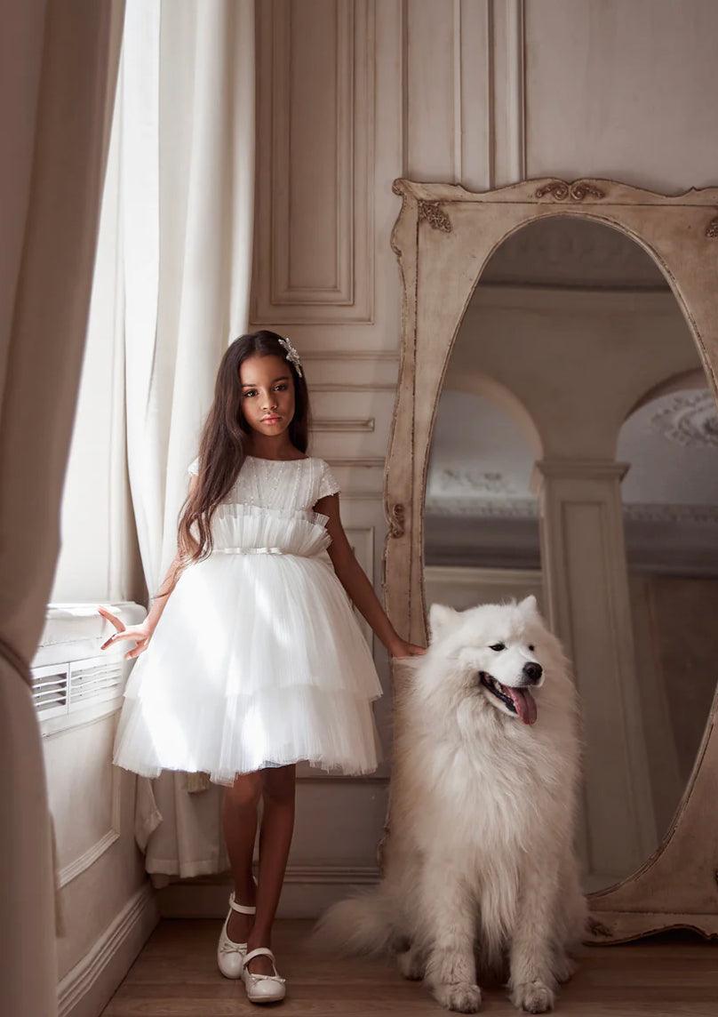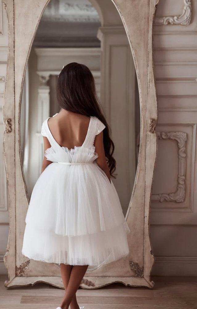 A tea-length girl's dress for a flower girl or junior bridesmaid is so lovely! The dress features a fitted bodice, cap sleeves, and an open back. A flouncy two-tier skirt in soft tulle has ruffle detailing at the waist. It is the perfect destination wedding flower girl dress or summer wedding kids' dress for a beach wedding. Guaranteed to make your little girl beautiful and comfortable!