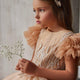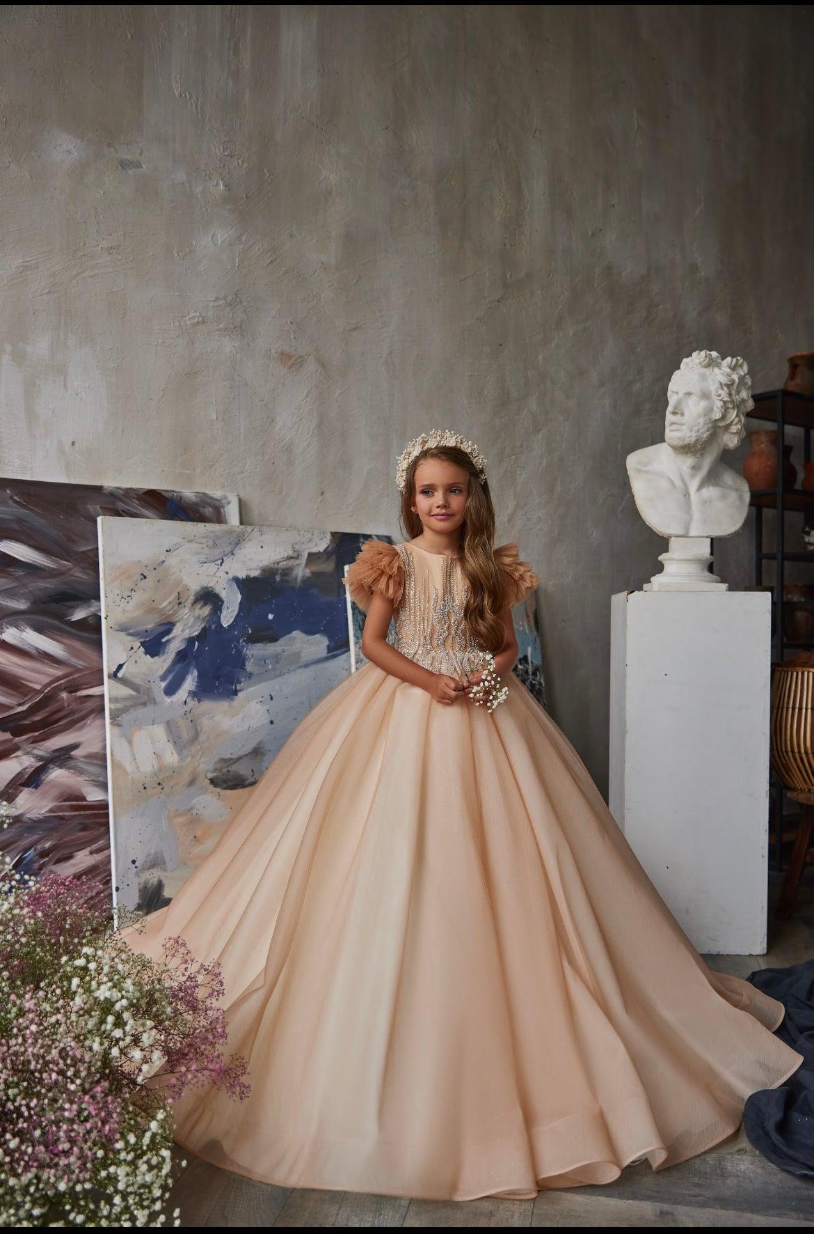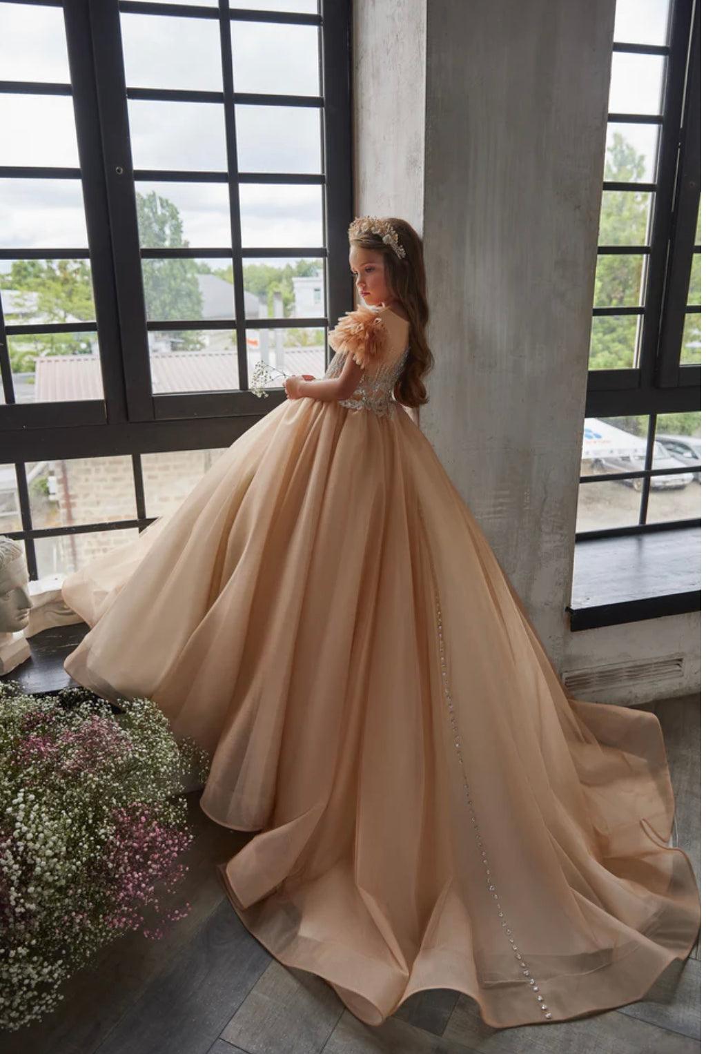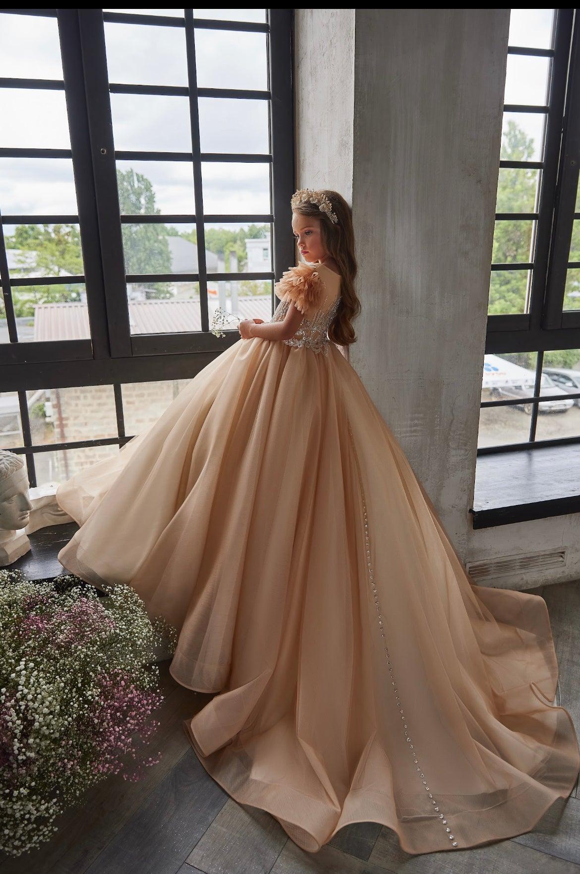 Beautiful lush outfit for the Princess in trendy cappuccino color. The corset of the dress is decorated with Italian lace, embroidered with beads and sequins, with every movement the corset shines spectacularly. The puffy lantern sleeves are made in rows. The fluffy multi-layered skirt goes into a long train, decorated with crystal buttons. A fabulous outfit with a royal train is the best way to make a girl happy and leave stunning photos as a keepsake.