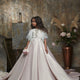 A gorgeous dress with an original design, in such an outfit the girl will definitely be in the spotlight! The corset of the outfit has a fashionable V-neckline on the chest, closed with beaded geometric applique. The collar of the dress is manually embroidered with shiny stones. Volumetric shiny lace with flowers and sequins adorns the corset and blends smoothly onto the skirt. Delightful cascading hangers are embroidered with sequins and beads. The satin lingonberry skirt is gathered in symmetrical folds and beautifully merges into the royal train. The beautiful back of the outfit also attracts attention.