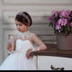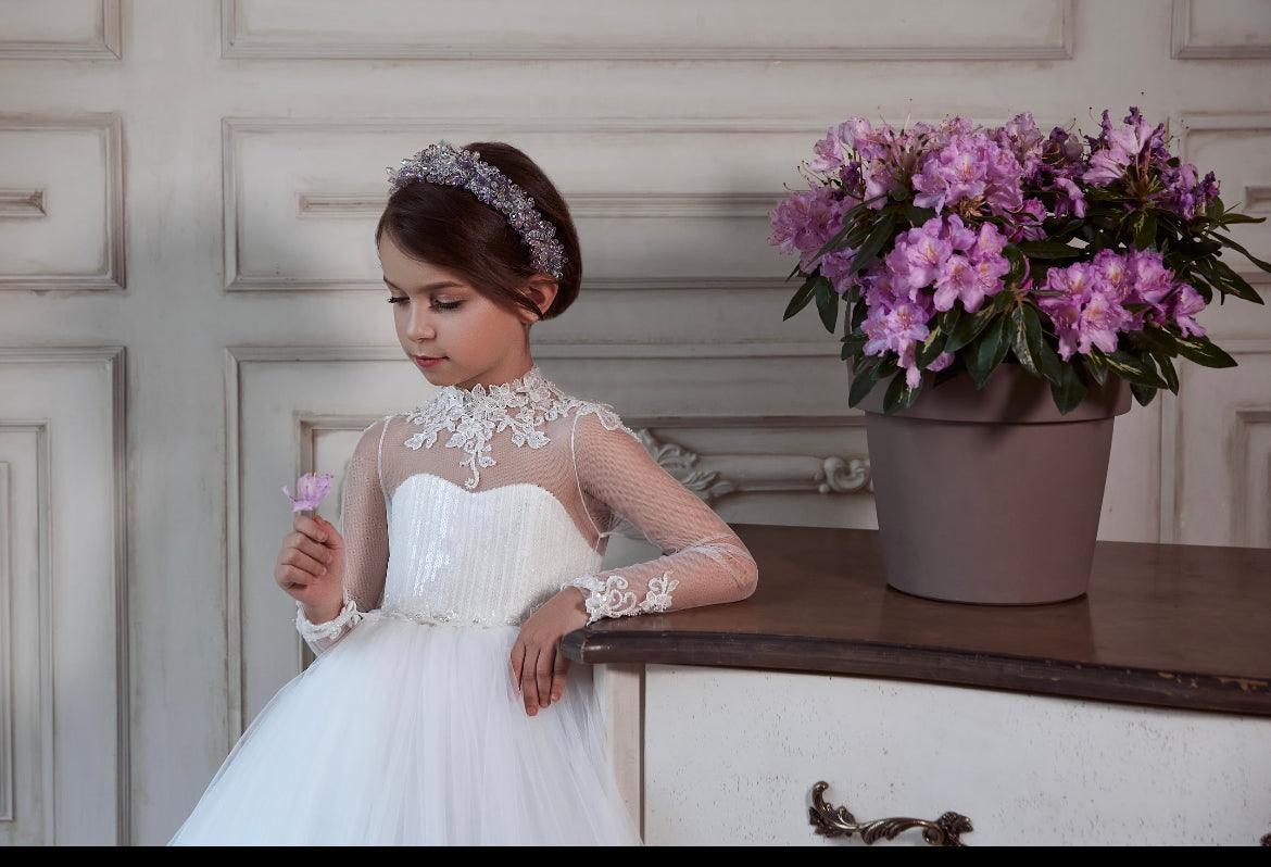 An elegant girls gown with fitted bodice and illusion neckline with long sleeves, this dress has a full tulle skirt. A floor-length this is the perfect flower girl dress or kids dress for a princess party or pageant. Guaranteed to make your little girl the belle of the ball, the Tatiana is pure elegance with its sash bow waist detail.