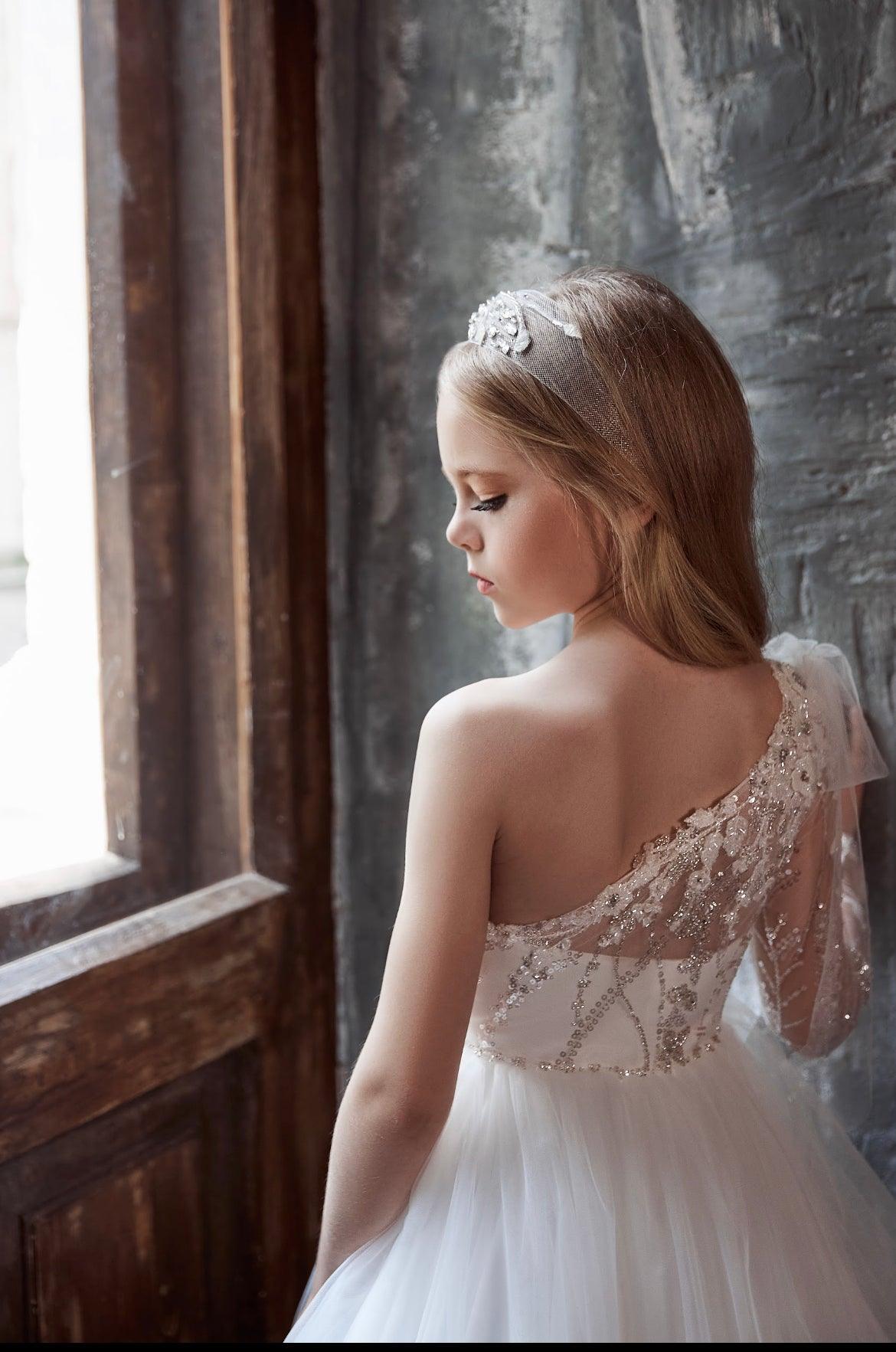 An elegant junior bridesmaid or flower girl dress with fitted embroidered lace bodice, this dress has a one-shoulder top with long sleeves. A full-length this is the perfect flower girl dress or kids dress for a princess party or pageant. Guaranteed to make your little girl the belle of the ball, this asymmetric gown is pure luxury & elegance with its sash bow waist detail.