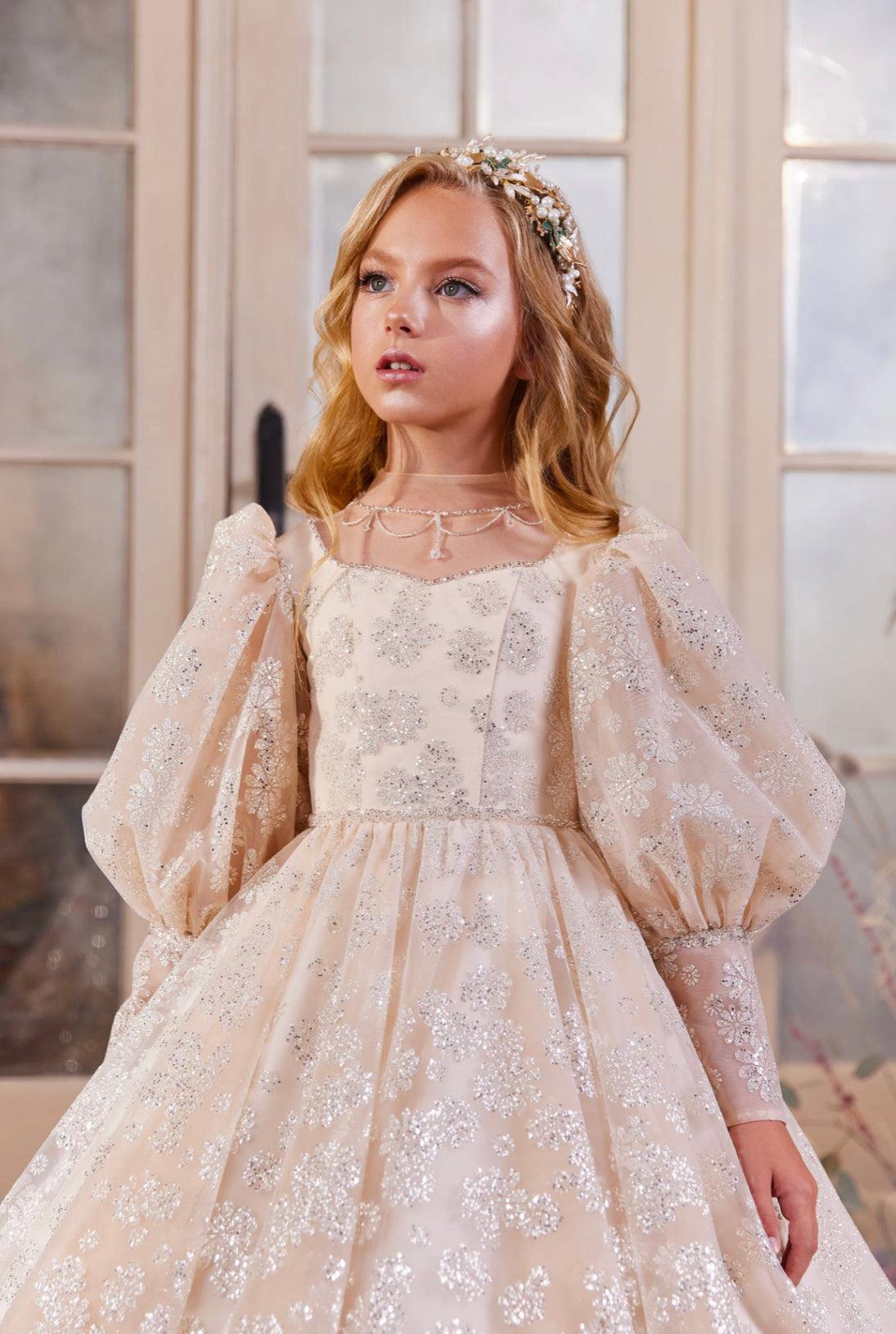 Designed in a soft champagne hue, the gown’s luxurious fabric is crafted with a subtle silver sheen, perfect for making any special occasion unforgettable. A gentle bow at the back and an open keyhole design offer a modern twist to this royal ensemble, providing both comfort and elegance. Whether for weddings, formal events, or grand celebrations, this gown is the epitome of luxury fashion for your little one.