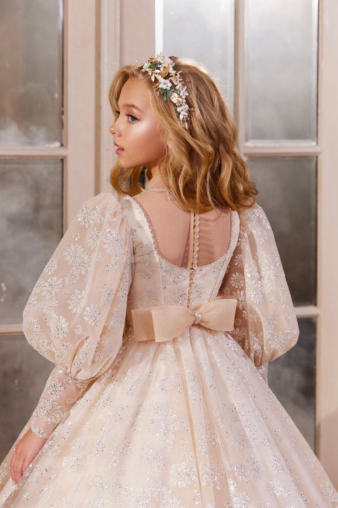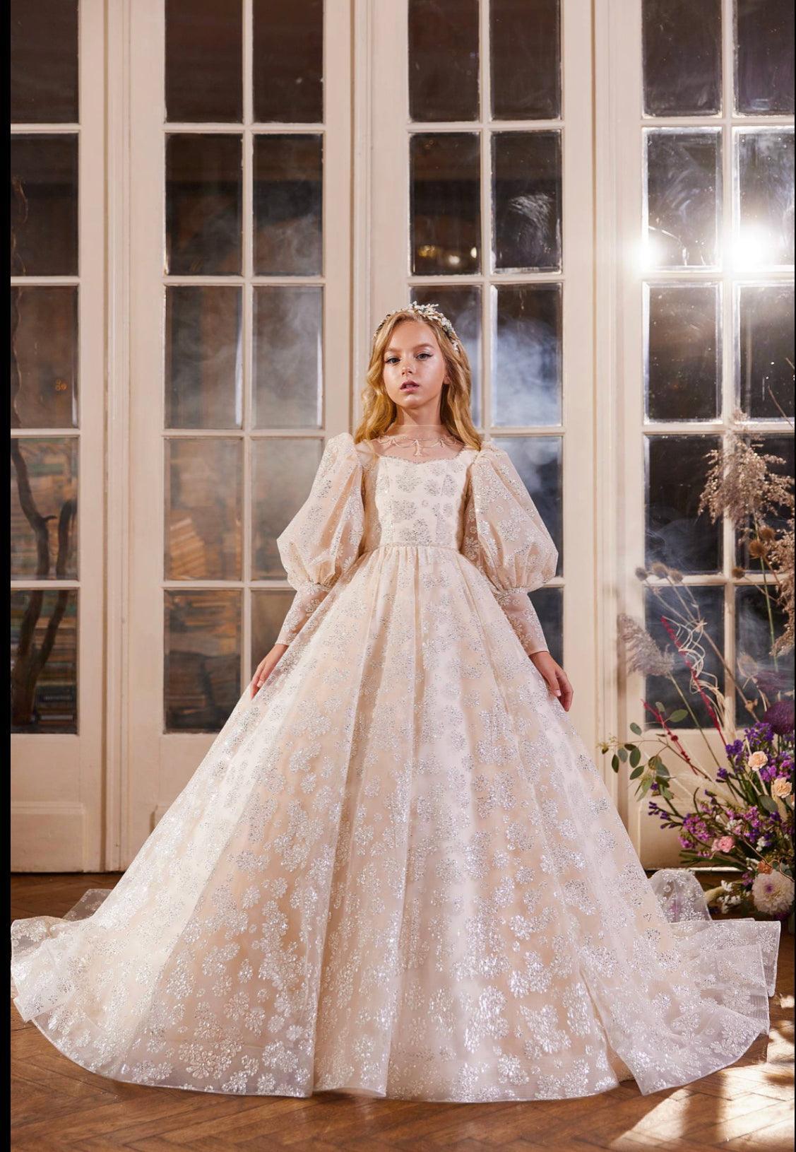 Step into a world of timeless sophistication with the "Elysian Elegance" gown, a masterpiece designed for the little princess who deserves nothing short of regal splendor. This enchanting ball gown features a voluminous silhouette adorned with intricate floral appliqué details, creating a breathtaking display of shimmering beauty. The delicate puff sleeves and square neckline add an air of classic charm, while the flowing, cathedral-length skirt ensures she commands every room with grace.