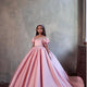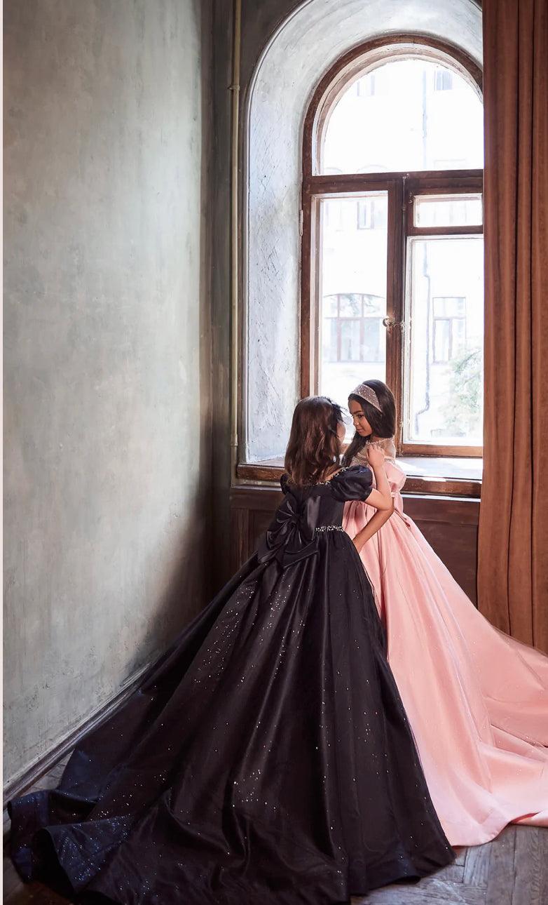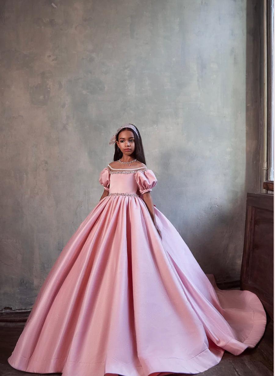 This blush flower girl gown is beyond elegant with puffed sleeves, a gorgeous illusion off-shoulder neck, and eye-catching details. If you prefer a princess-style silhouette, this girl's gown is a beautiful option. Do her hair up to show off a stunning bead embroidery and velvet trim framing her shoulders and neck. What smore, crystal buttons in the back paired with an oversized bow undoubtedly make her feel unique and attractive.