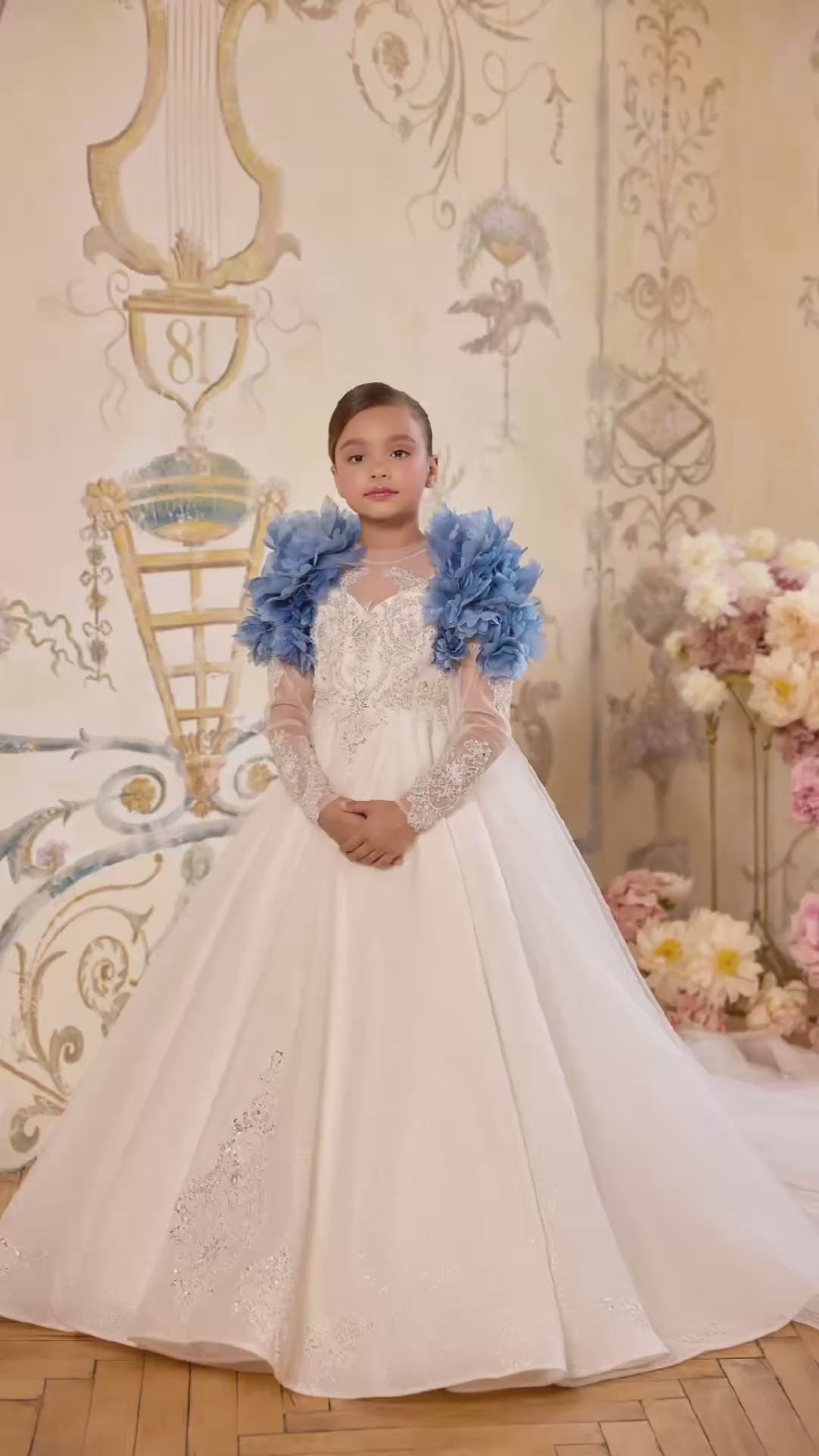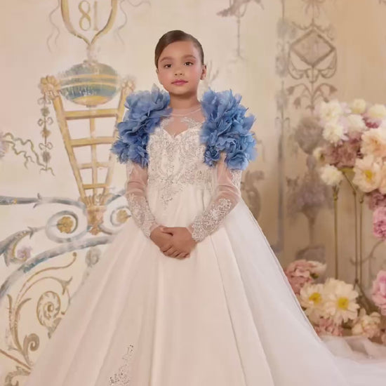 What makes this gown truly unforgettable is its statement floral shoulder cape—voluminous layered blue blooms that create a breathtaking silhouette and elevate the look to runway royalty. The chapel-length train flows behind like a cloud of grace, making this gown a show-stopping choice for communions, red-carpet events, birthday galas, or pageants fit for a princess.
