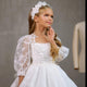 Featuring a sheer tulle overlay with floral lace details, every inch of this stunning dress conveys a dignified air of magical charm. The intricate embroidered lace design is finished with appliqued flowers, sparkling beads, and sequins throughout the bodice, sweeping up to the elegant choker-style illusion neckline. The puff sleeves are lightweight and elegant, beautifully complementing the details throughout the skirt, while the gathered waistband is finished with yet more petal details to enhance the stunning silhouette. The large bow at the back of the waist features the same lace design, showcasing the skirt as it flows gracefully with every movement.