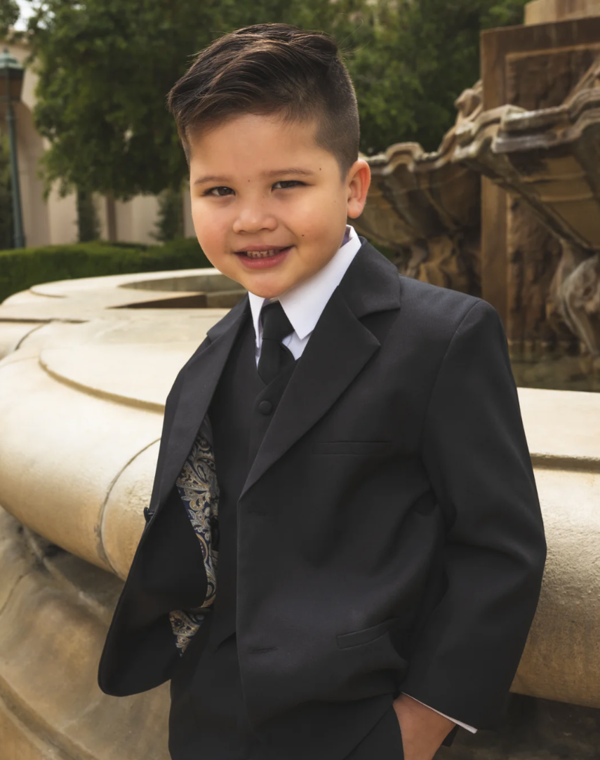 Pair with black dress shoes and a pocket square for a sophisticated finish. Whether he's the ring bearer, guest of honor, or simply wants to dress the part, The Joey Black Suit ensures he always looks his best.