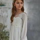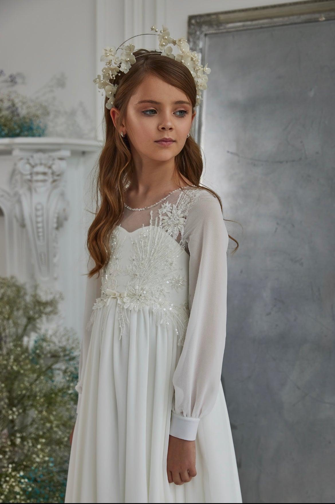 Looking for a soft and modest First Communion dress for the upcoming Communion? This pretty garment with the bishop sleeves and a chapel train is a perfect choice for your girl. The beading design covers the front and the back of the scoop-neck illusion bodice. Layers of soft chiffon flow in an A-line shape, emphasizing this girl dress' angelic appeal.