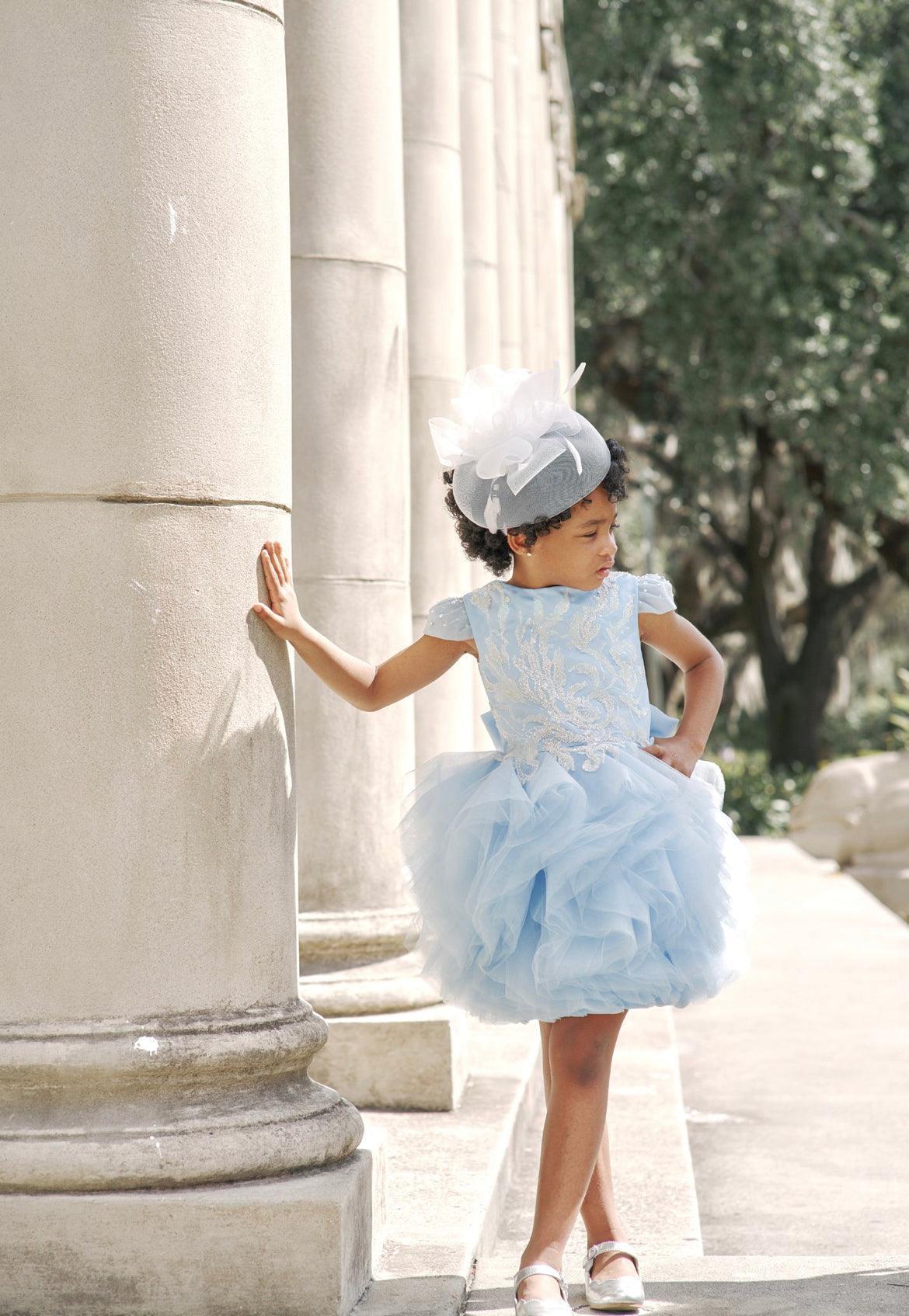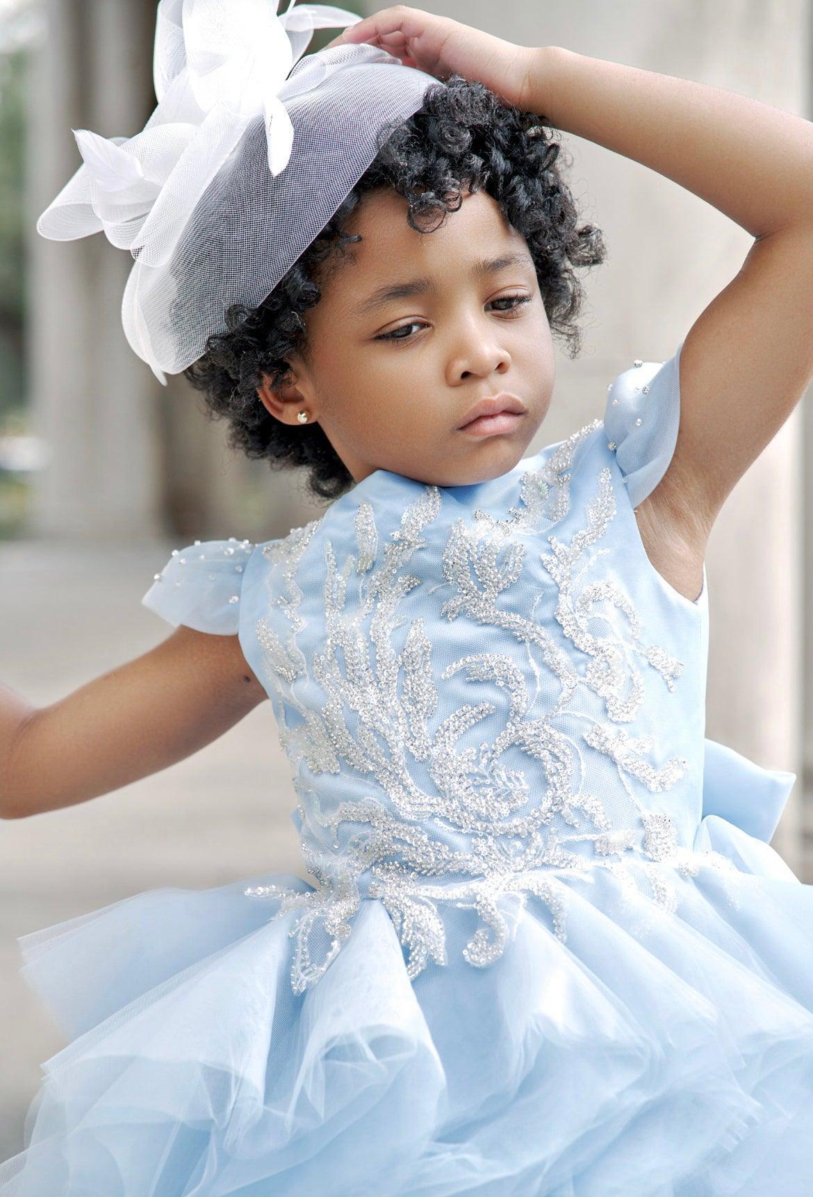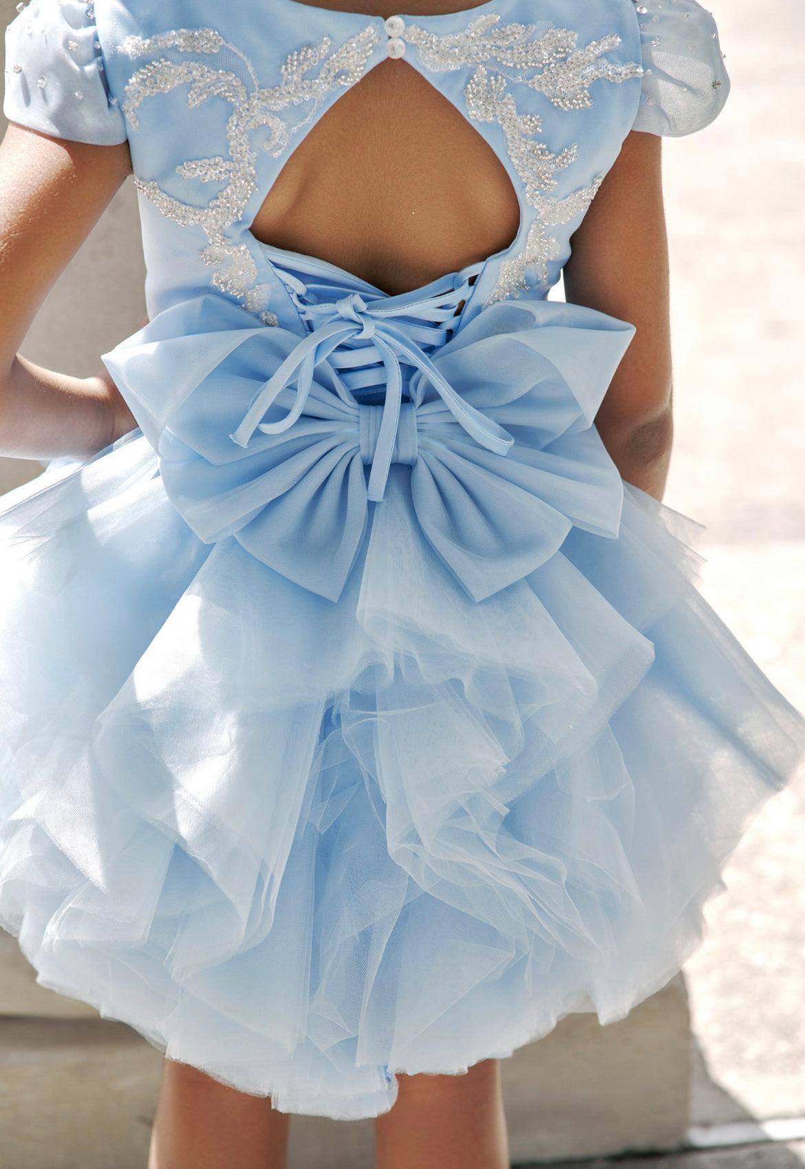 The delicate blue hue is reminiscent of a clear, serene sky, making it a perfect choice for a princess who loves to twirl and dance. The dress is completed with cap sleeves and a comfortable fit, ensuring she feels as wonderful as she looks.