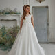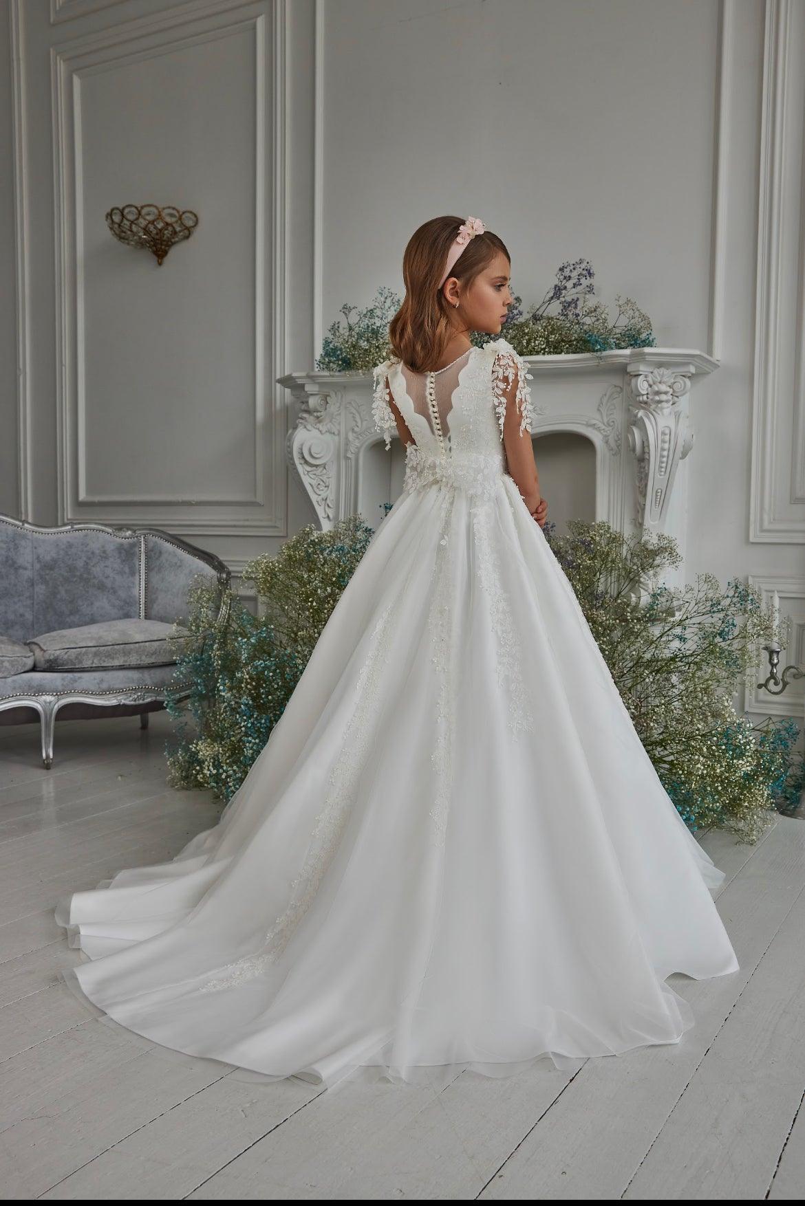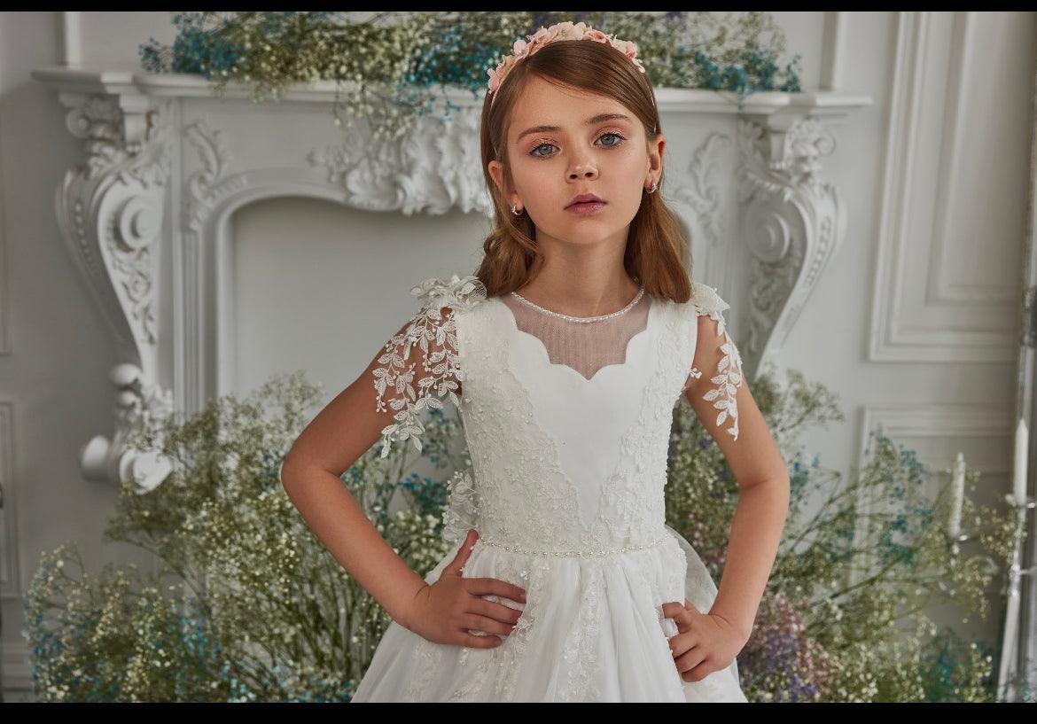 This is a stylish lace First Communion girl's dress with short sleeves and a full skirt elongated at the back. The gown features floral lace appliques scattered over the top, shoulders, and skirt, making this dress absolutely adorable. The back of the dress makes a statement with a row of buttons over an illusion neckline, a lace bow, and a short train.