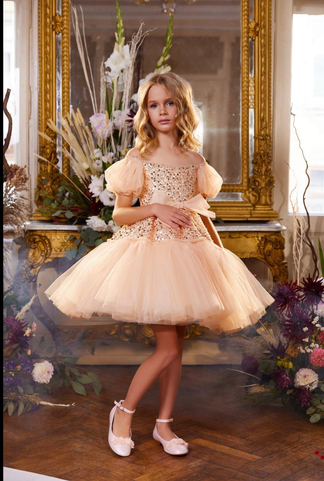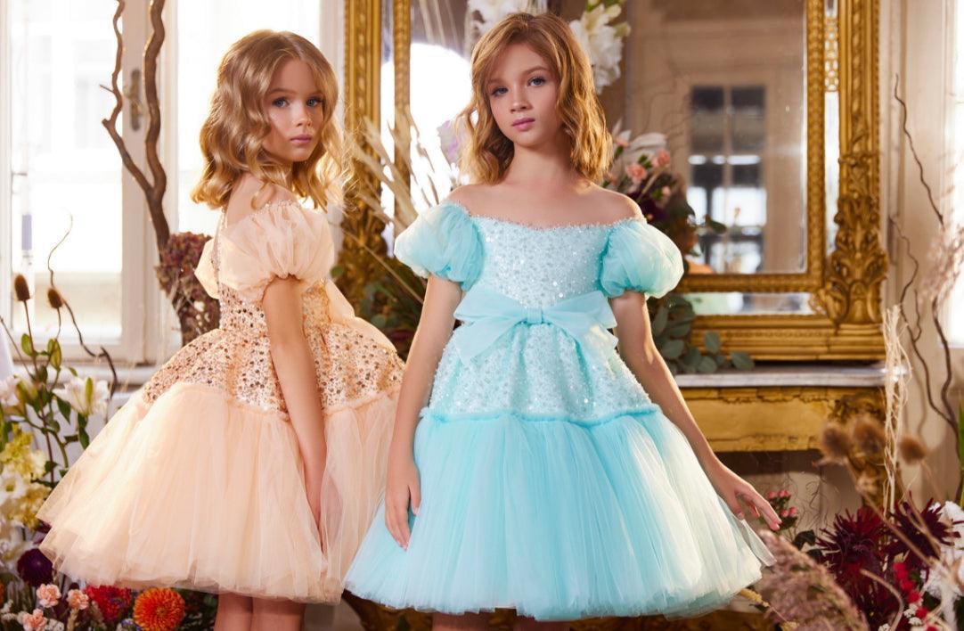 Discover the enchanting Aurelia Fairytale Party Dresses in refreshing mint green and delicate peach—designed to make your little princess feel like royalty. These dresses feature a playful yet elegant silhouette with a tiered, voluminous tulle skirt that adds just the right amount of drama for any special occasion.