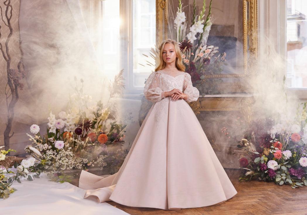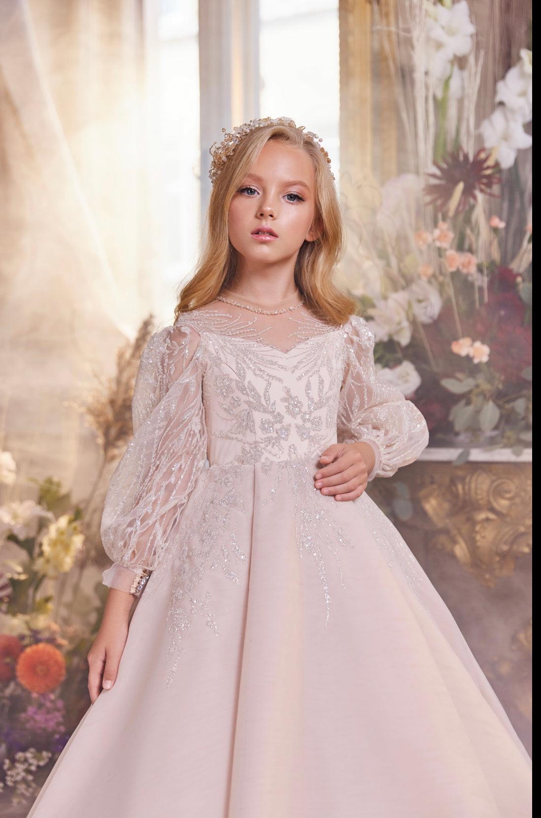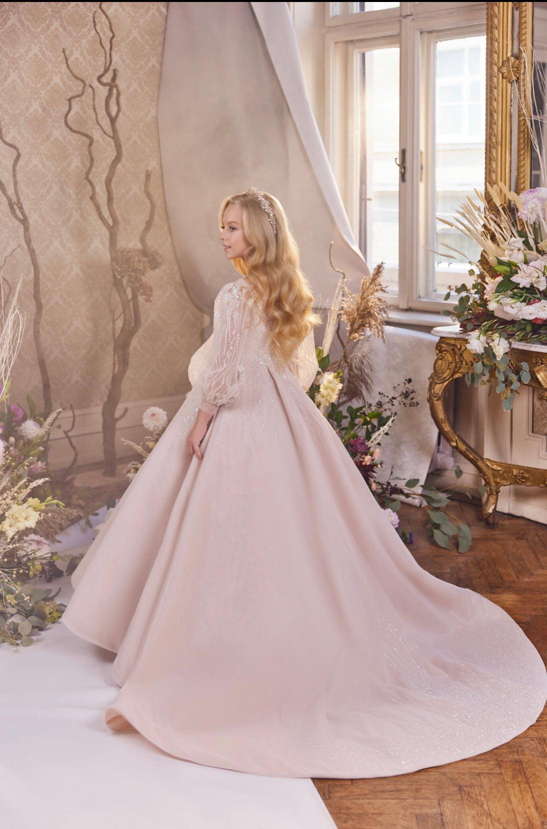 Step into a fairytale world with our Princess Evangeline Couture Gown. This exquisite dress is designed to make your little princess feel like royalty on her most special occasions. Featuring a voluminous A-line silhouette, this gown is adorned with delicate hand-embroidered details that add a touch of elegance and luxury.