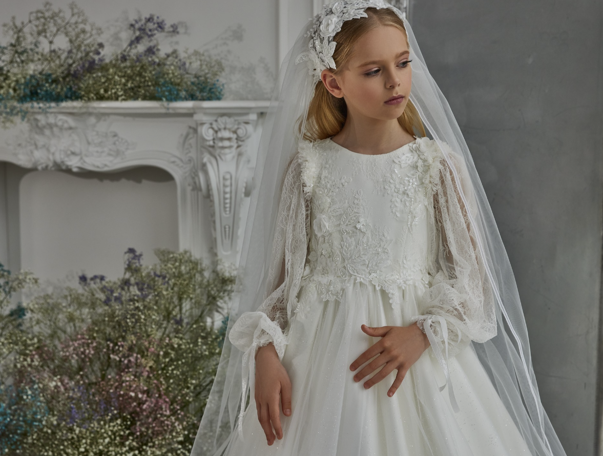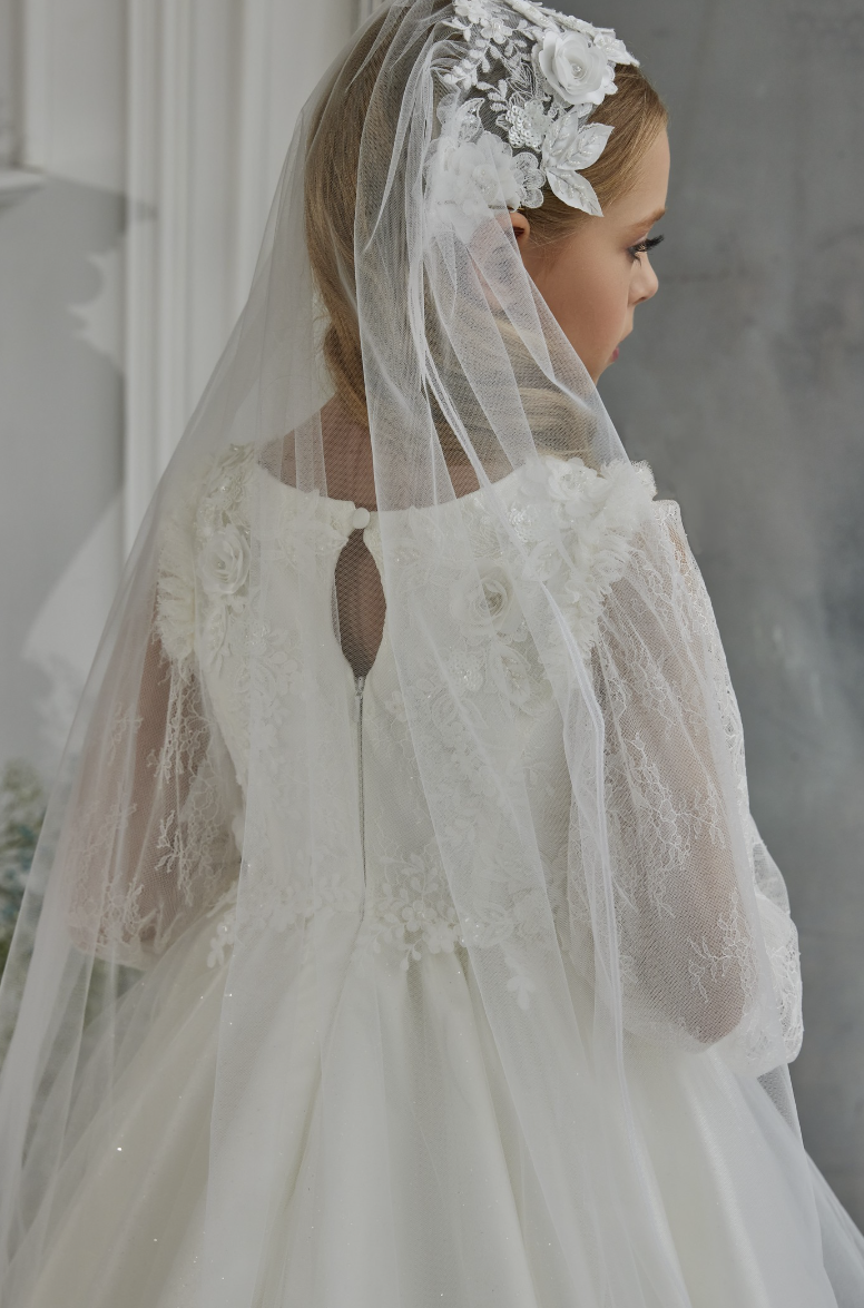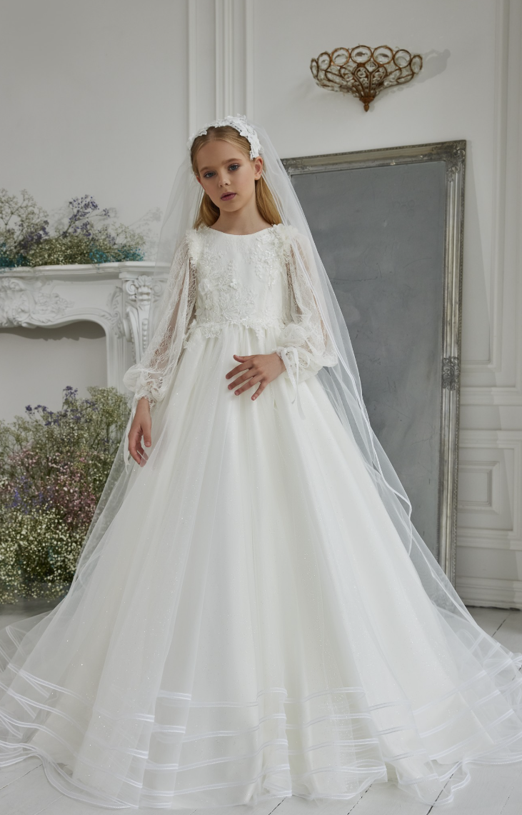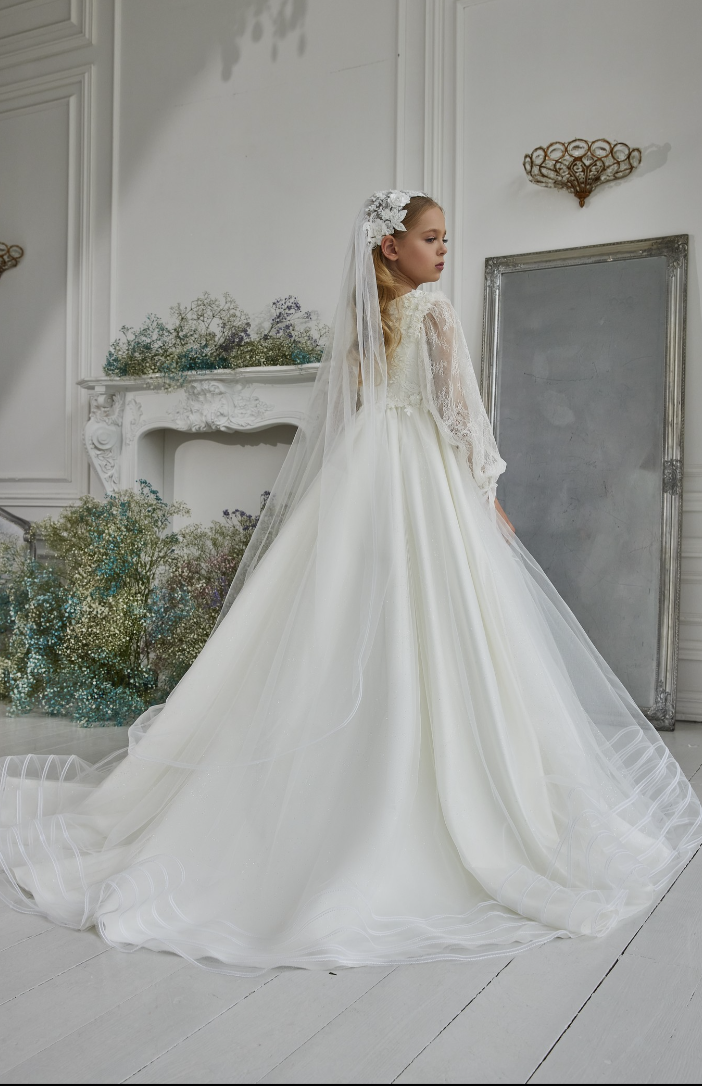 The back keyhole detail and floral accents add a timeless touch, while the flowing silhouette ensures your little one moves with grace and confidence. Whether for a First Communion, a flower girl role, or a formal celebration, the Ophelia Gown is made to create memories that last forever.