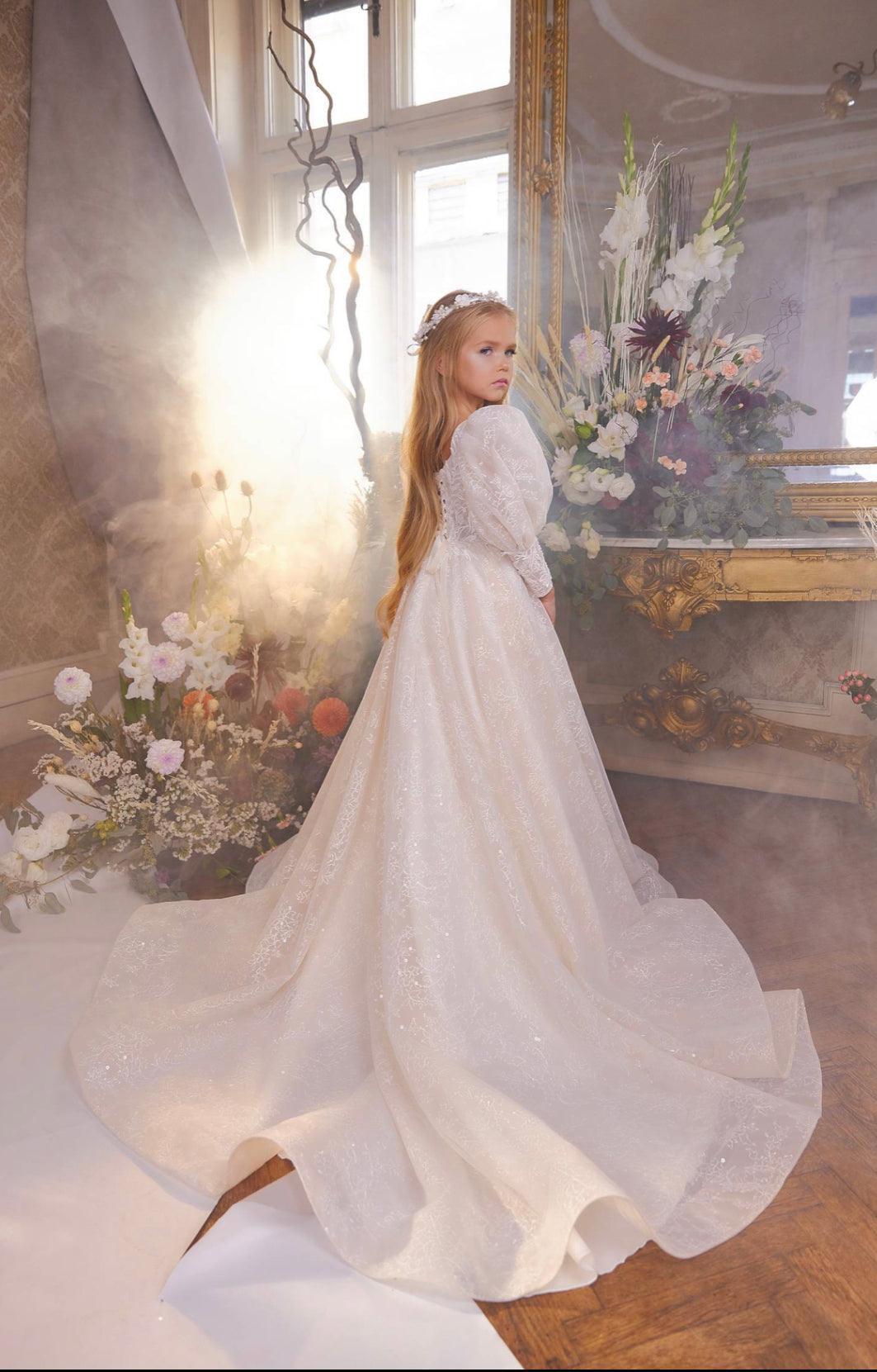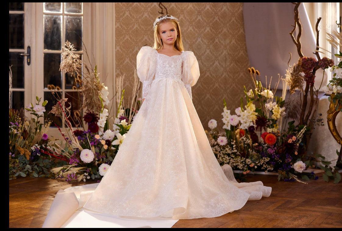 Introducing the Princess Ophelia Couture Gown, a breathtaking masterpiece of elegance and grace. This exquisite gown is designed for the little princess who dreams of making an enchanting entrance. The dress features a full A-line silhouette with a floor-length skirt that gracefully cascades into a sweeping train, creating an ethereal effect with every step.