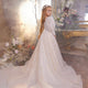 The gown’s bodice is delicately crafted with intricate floral lace details and soft shimmer accents, while the puffed long sleeves add a touch of vintage sophistication. The back of the gown is adorned with delicate buttons, enhancing its regal charm. The luxurious fabric radiates a subtle sparkle, making it perfect for weddings, formal events, or any special occasion where she wants to shine.