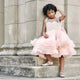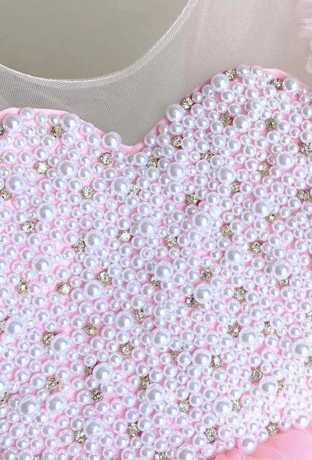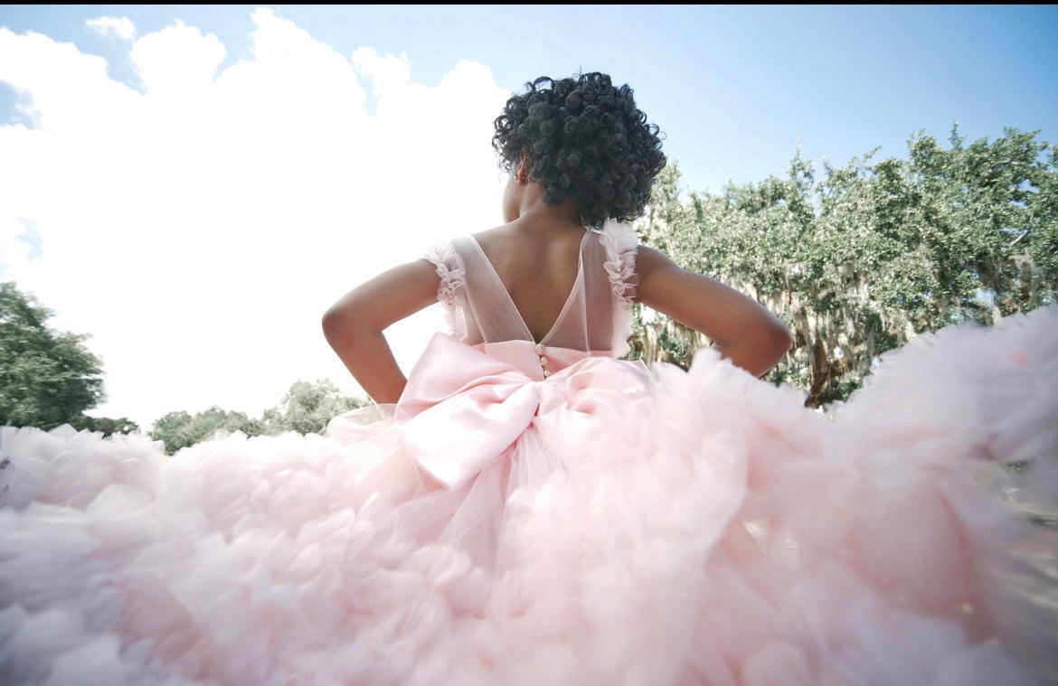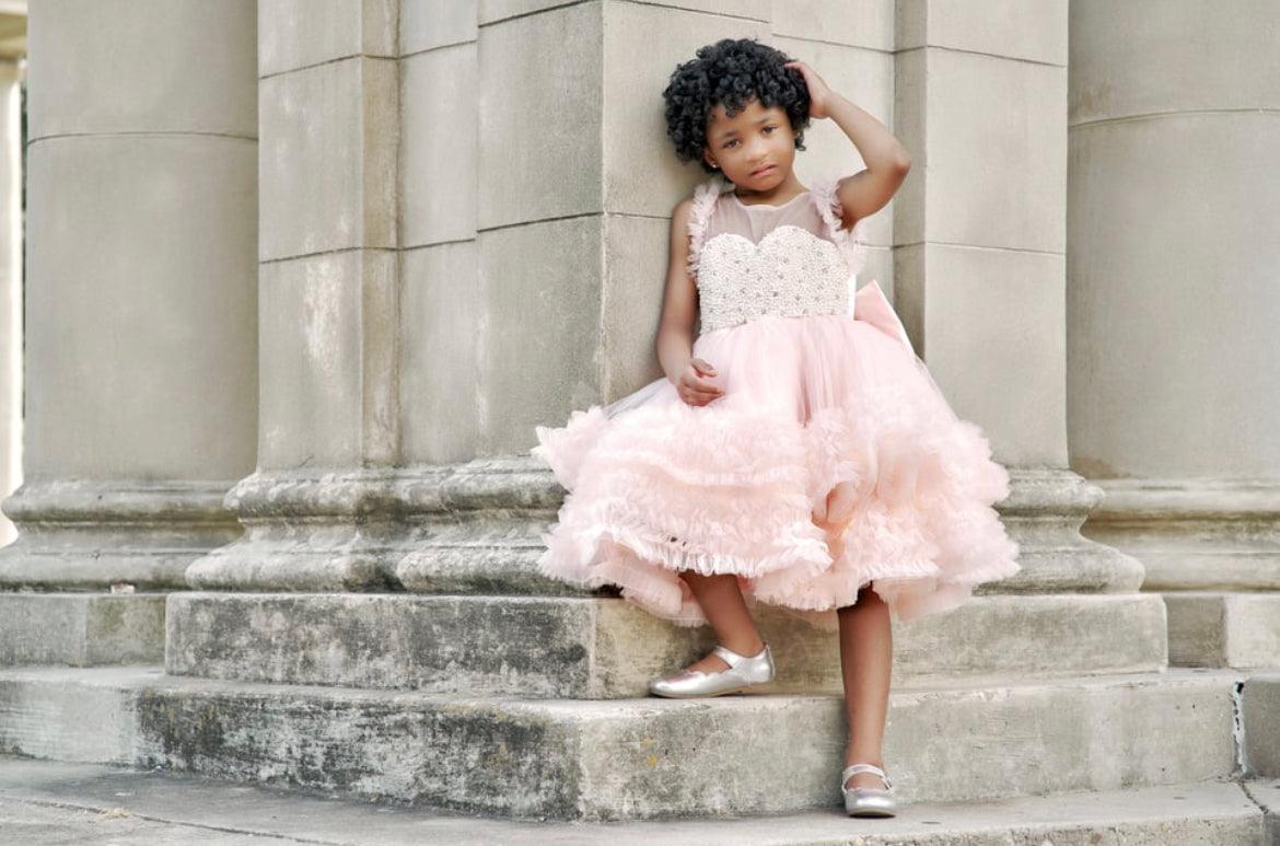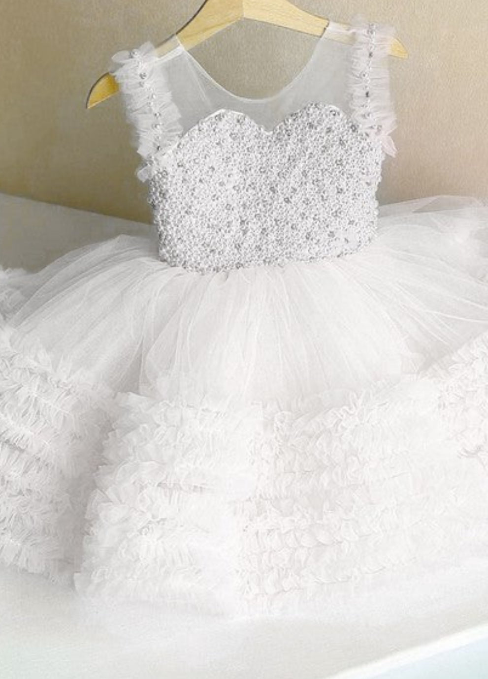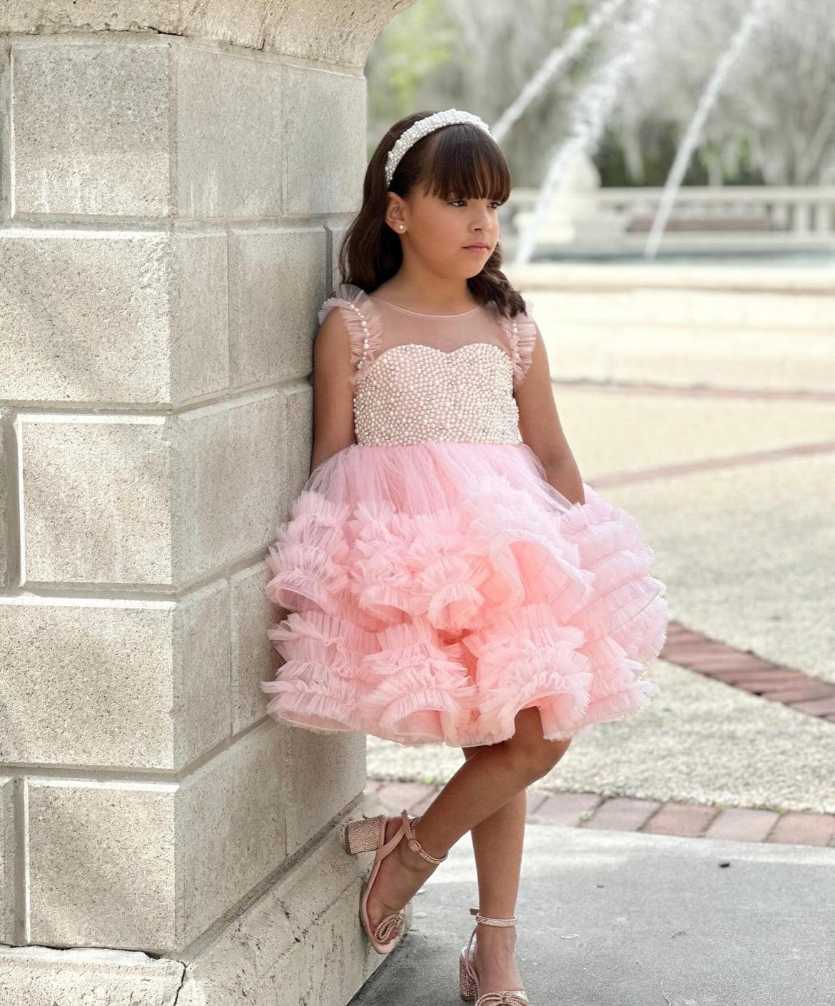 Make every moment magical with the Enchanted Bloom Ruffle Dress—designed for the princess who loves elegance and playfulness in equal measure. This exquisite dress boasts a pearl-embellished bodice shaped like a blooming heart, perfectly complemented by layers of ethereal tulle ruffles for an unforgettable silhouette. The back features a luxurious satin bow and gleaming gold buttons, adding a sophisticated finish to this fairytale-inspired look. Whether for a birthday, communion, or flower girl debut, this dress ensures she shines in every photo and memory.