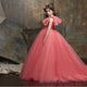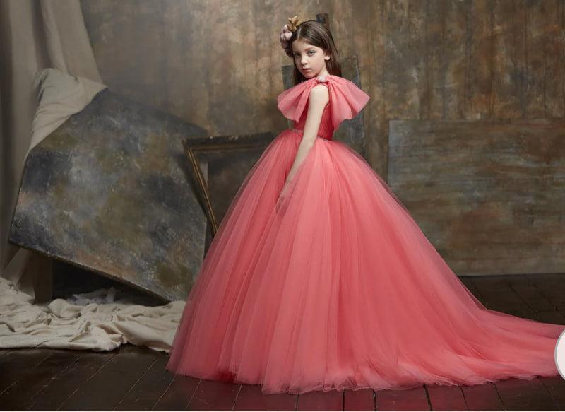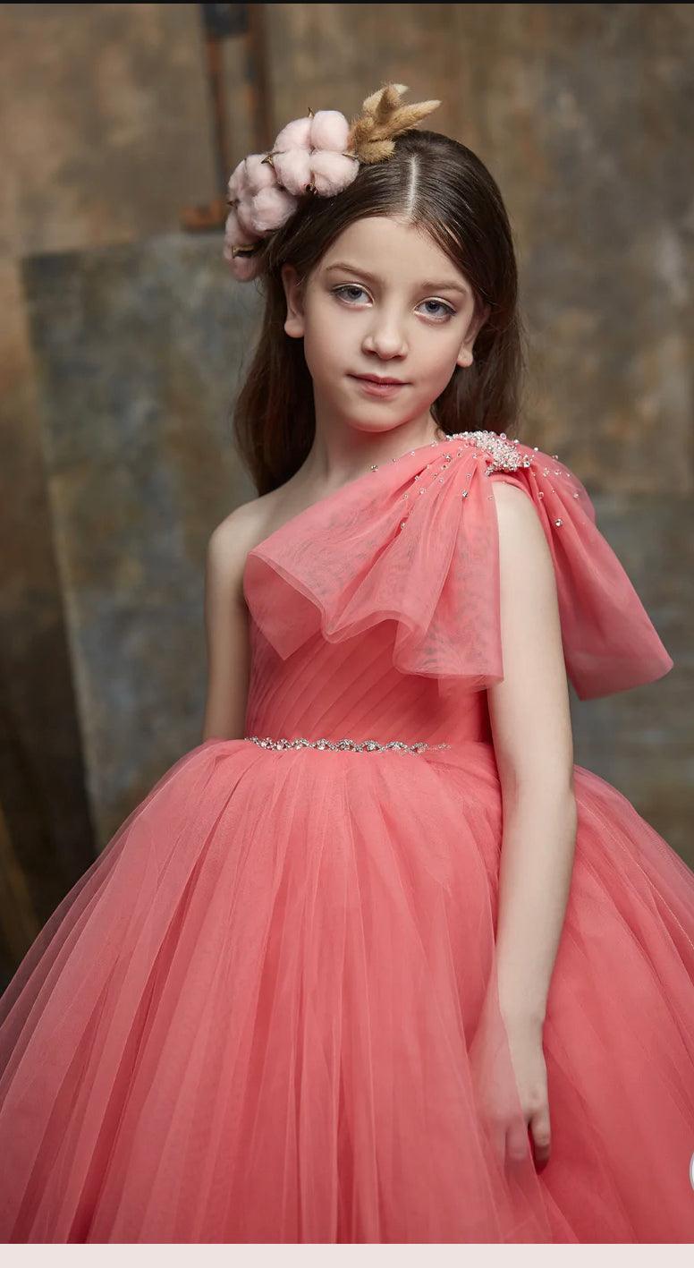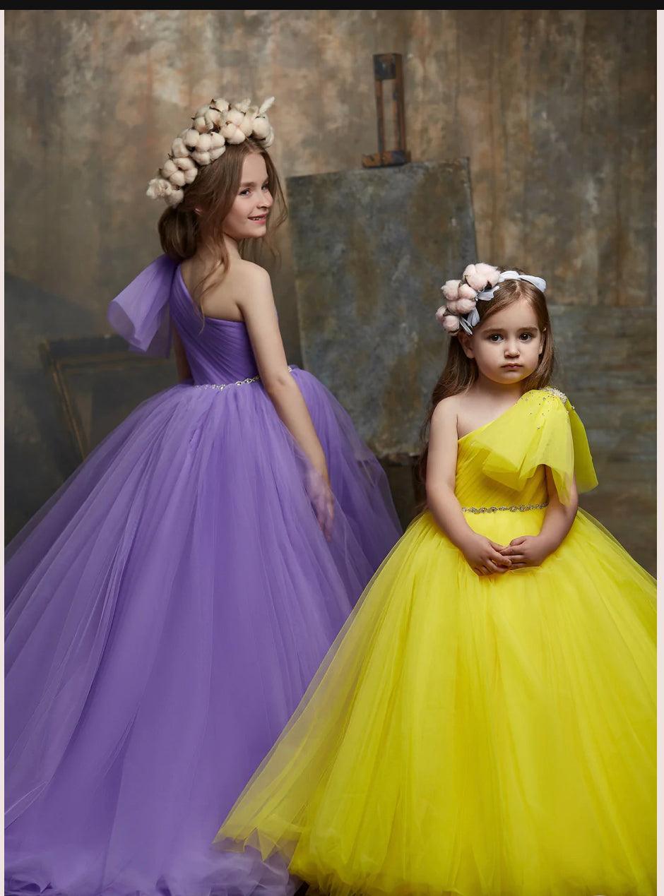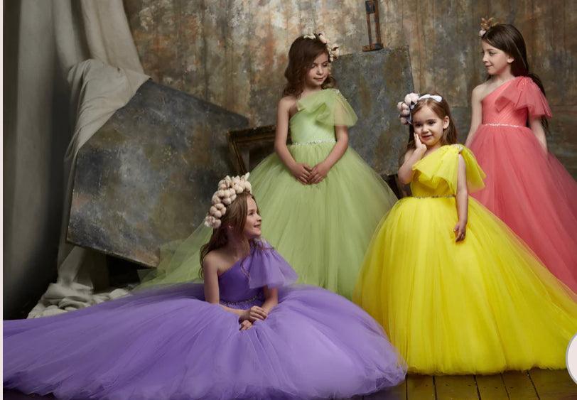 A very beautiful dress that won the hearts of our Princesses! The asymmetrically draped corset on one shoulder is decorated with a large bow embroidered with faceted Czech beads and rhinestones. The girdle of the dress shines and shimmers with a brilliant scattering of stones. A fluffy multi-layered tulle skirt looks very beautiful and airy, smoothly turning into a luxurious train. The dresses are presented in violet, lemon, pistachio, and coral colors. Other colors are also available to order!