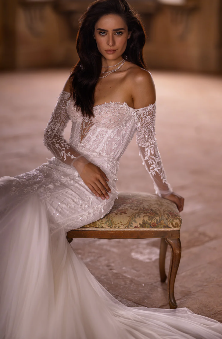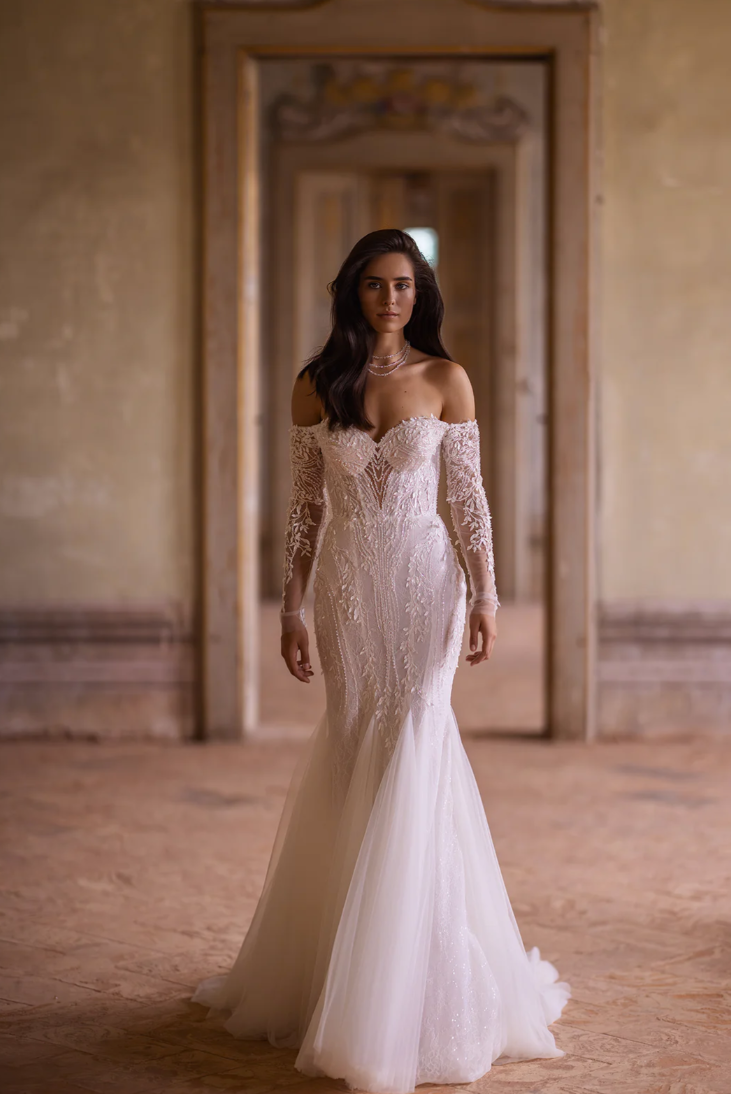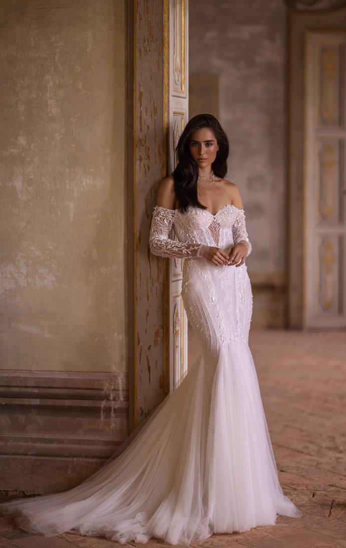 Pair this gown with crystal drop earrings, a soft low bun, and a cathedral-length veil for a look that radiates red carpet elegance. Perfect for oceanfront ceremonies, cliffside “I dos,” or any destination that calls for breathtaking beauty with a touch of ethereal drama.
