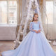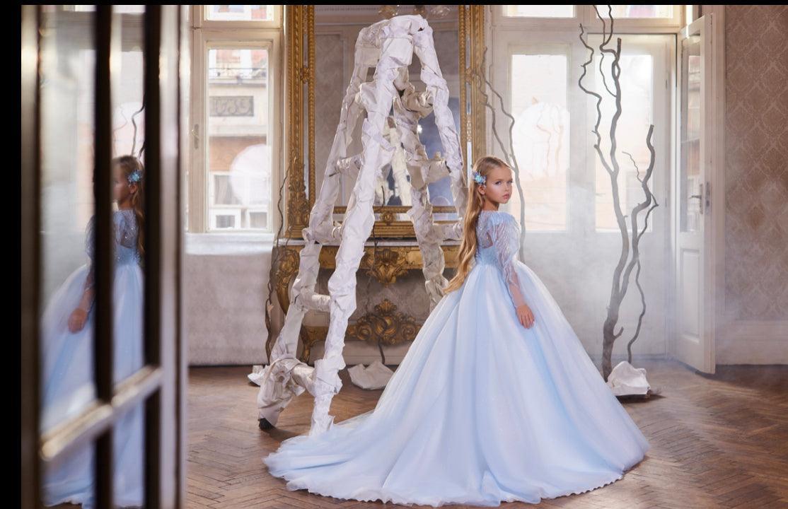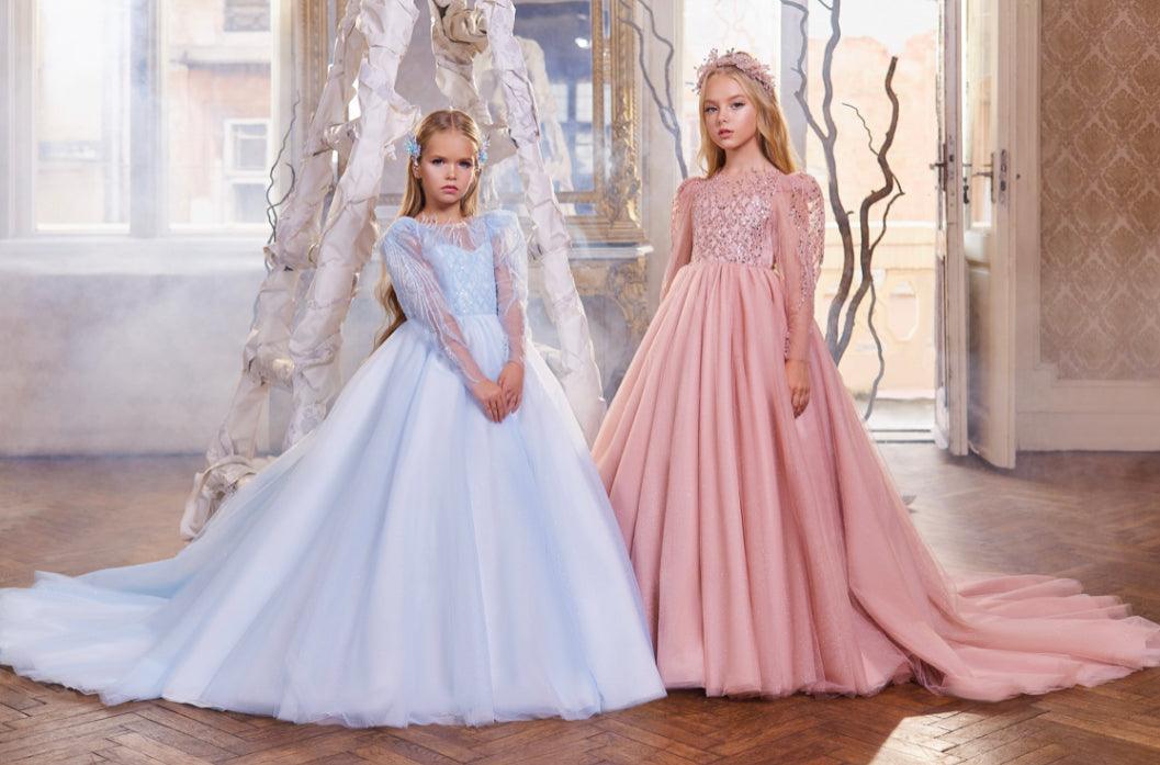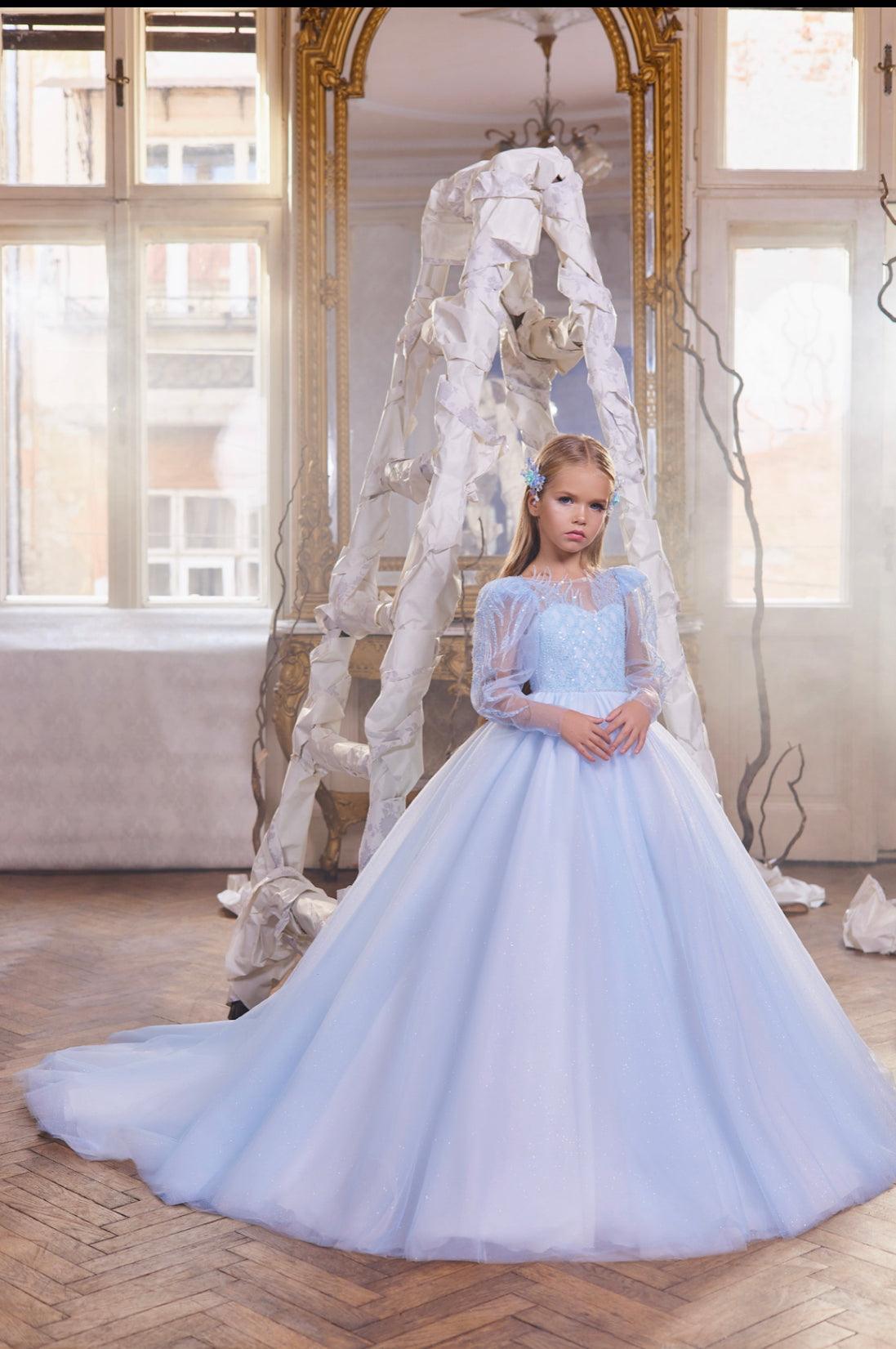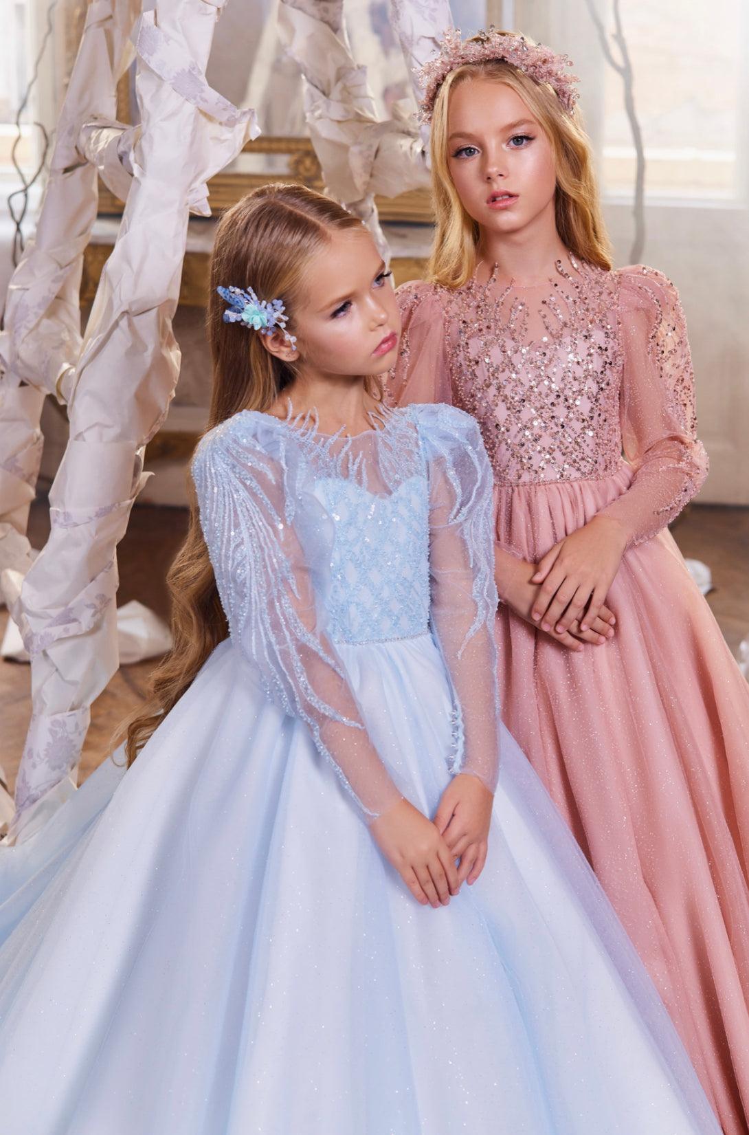 This elegant gown set, featuring delicate shades of blue and blush, is perfect for any little princess looking to embrace her inner royalty. The blue gown showcases an illusion neckline with a soft, sheer overlay and long, embroidered sleeves, giving it a graceful and ethereal appearance. The bodice is adorned with subtle floral appliqués, which blend seamlessly into the voluminous layered skirt, creating a look that’s both timeless and whimsical.