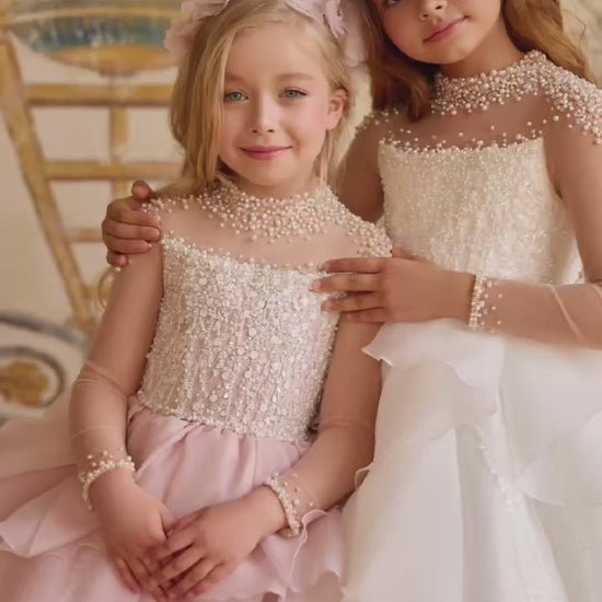 A celebration of elegance, grace, and modern fairytale charm, the Amoura Gown is a breathtaking statement piece designed for unforgettable entrances. Available in romantic blush or timeless white, this gown is adorned with hundreds of hand-applied luminous pearls and sequins, delicately cascading across the bodice and sheer neckline like a star-kissed veil.