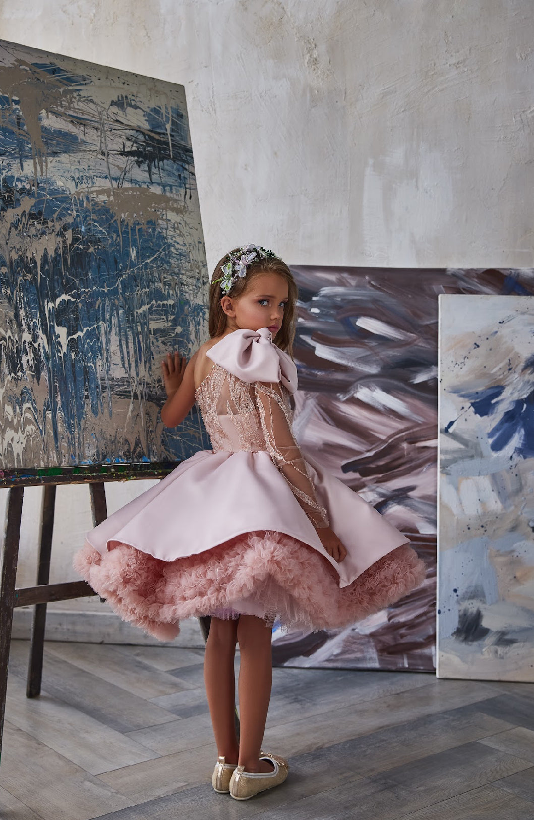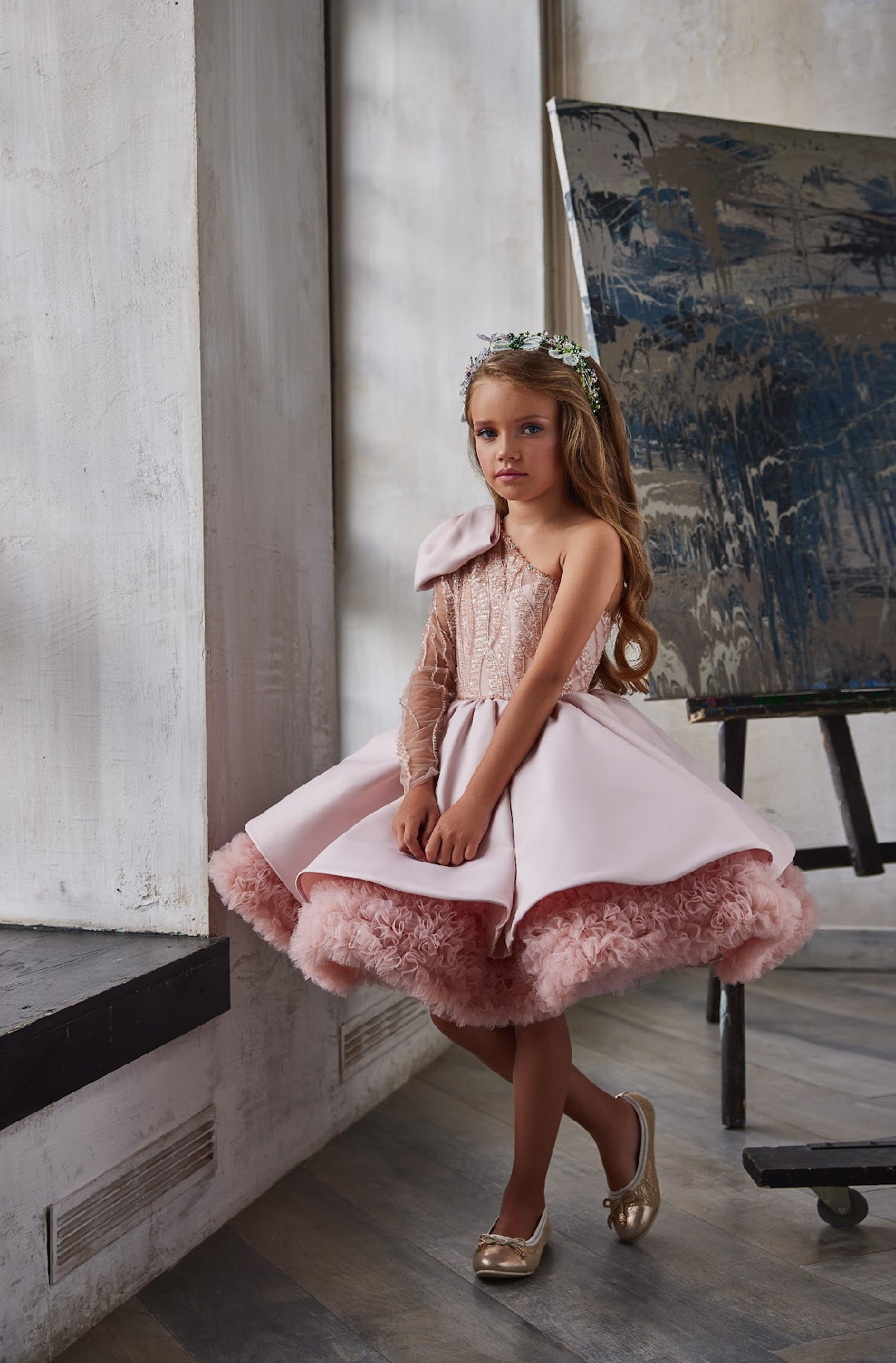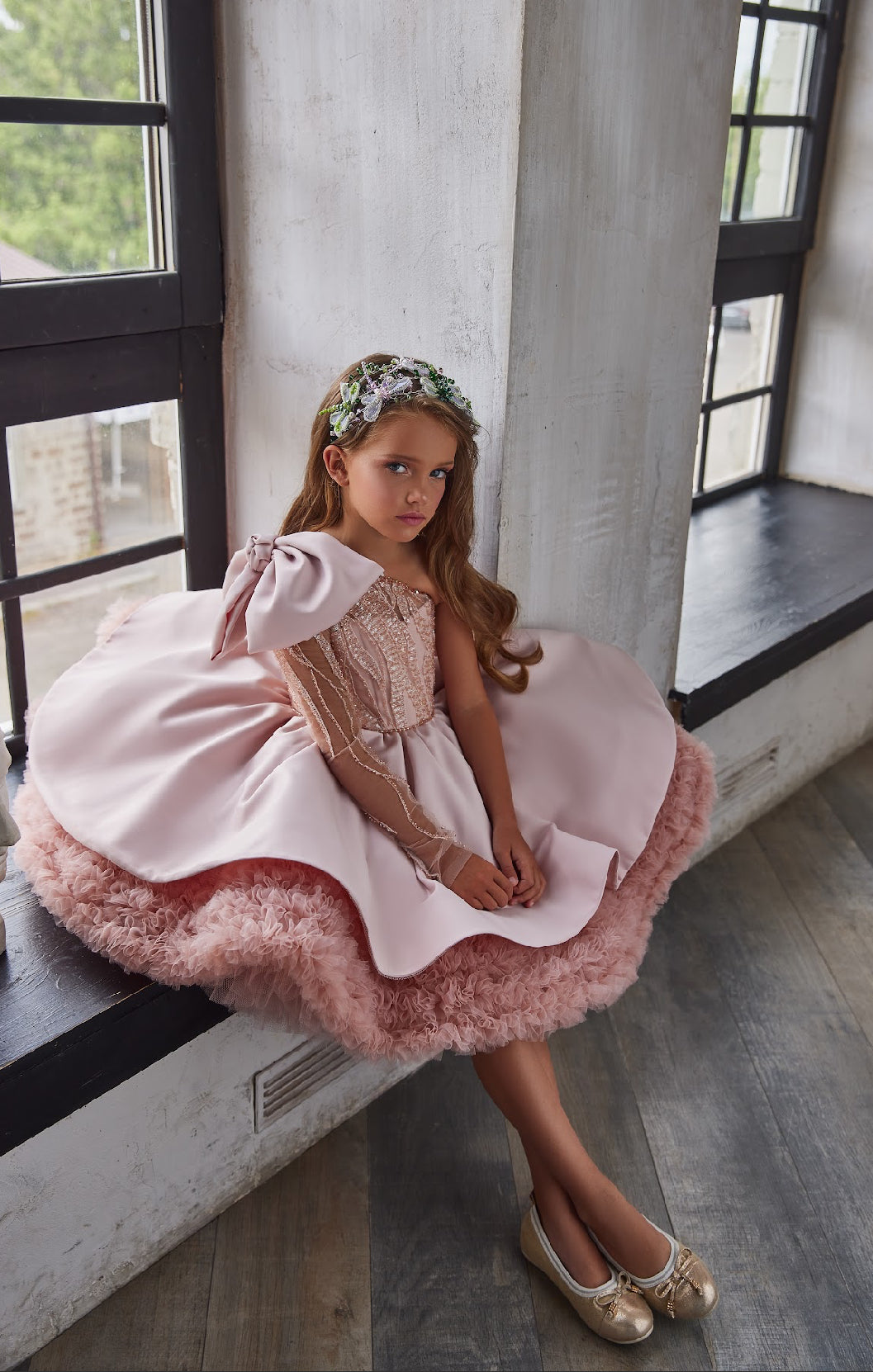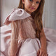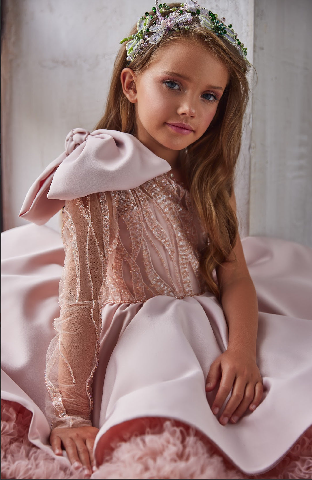 A sheer illusion sleeve, delicately embroidered and finished with fine bead accents, adds sophistication and uniqueness to the silhouette. Perfect for portraits, runway moments, and unforgettable celebrations, the Aurelia Rose Gown captures the magic of childhood with the grace of haute couture.