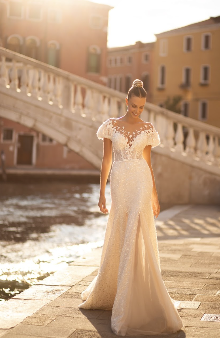 Pair this gown with pearl drop earrings, a sleek chignon, and a cathedral-length veil for a look that radiates regal sophistication. Ideal for garden weddings, romantic villas, or timeless church ceremonies.