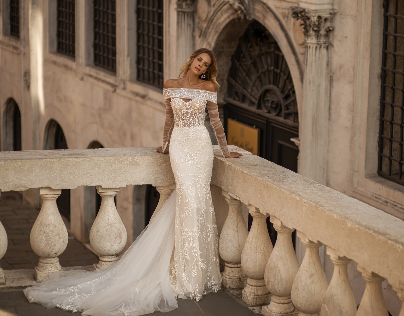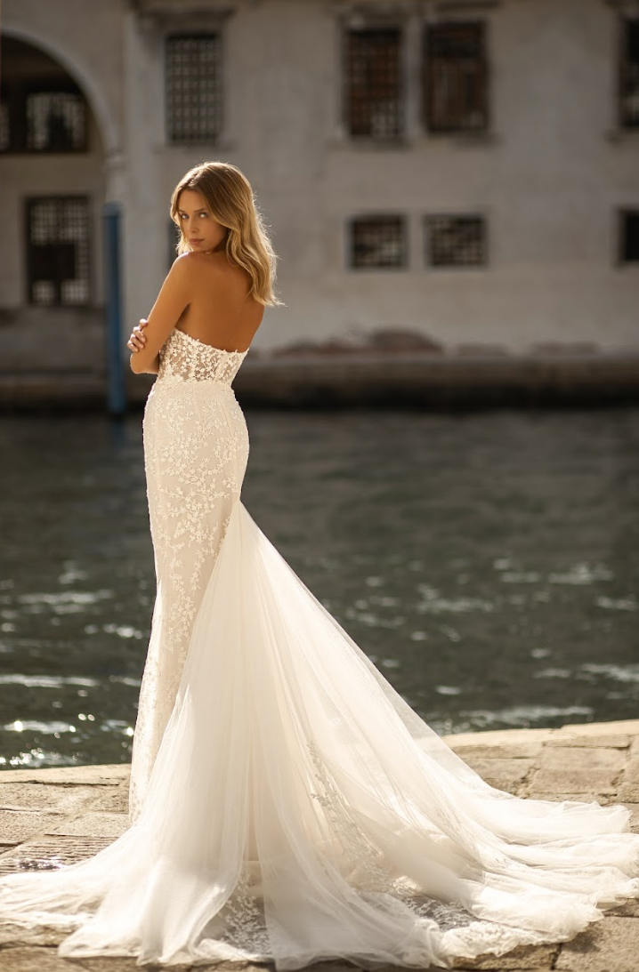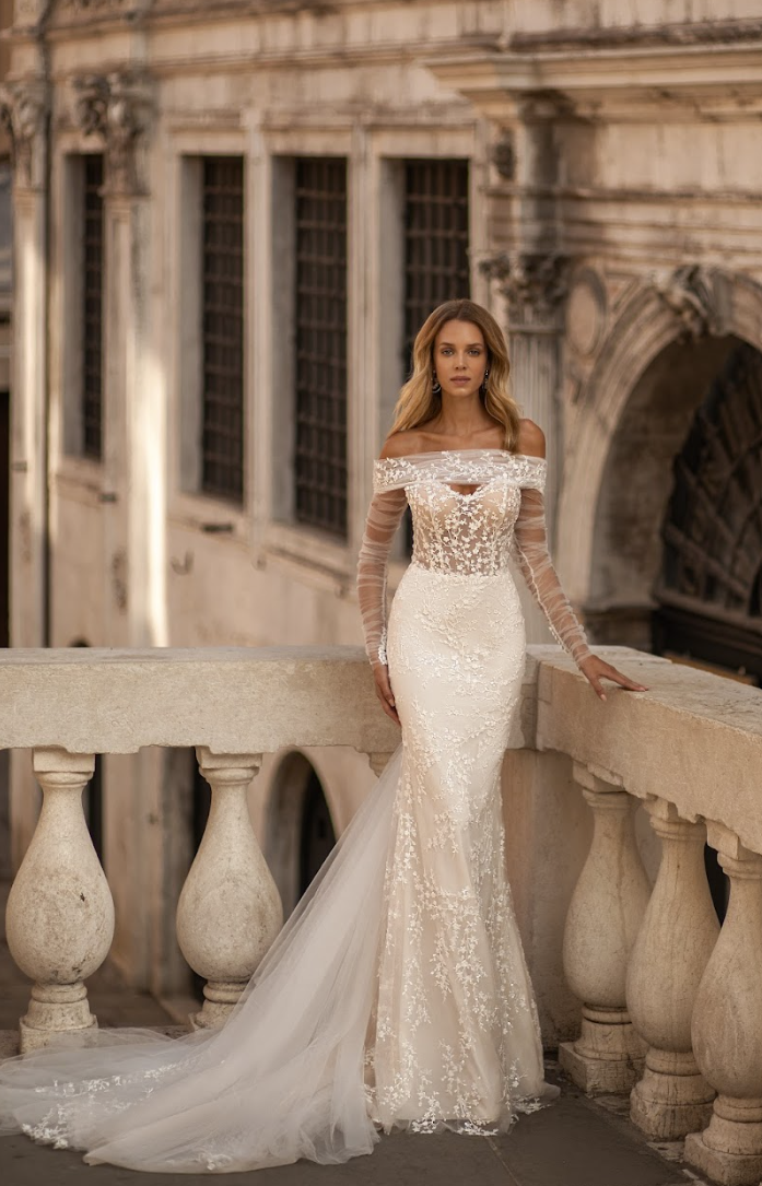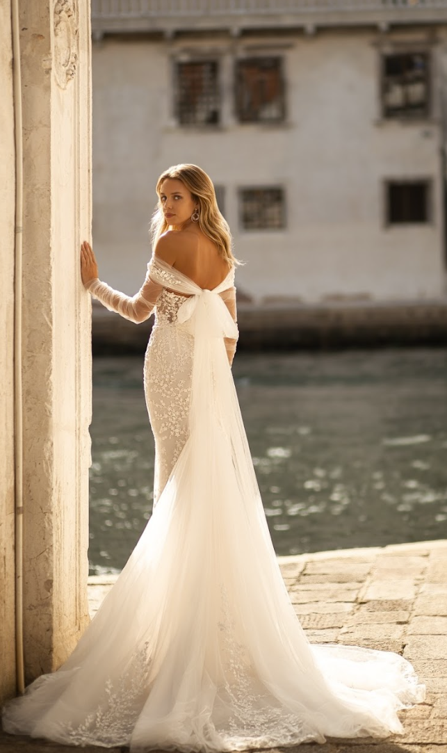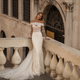 Pair this gown with soft waves or a romantic low chignon, pearl drop earrings, and a shimmering cathedral veil for a look that radiates sophistication and dreamy elegance. Perfect for a waterfront ceremony, an enchanted garden soirée, or a candlelit cathedral affair.
