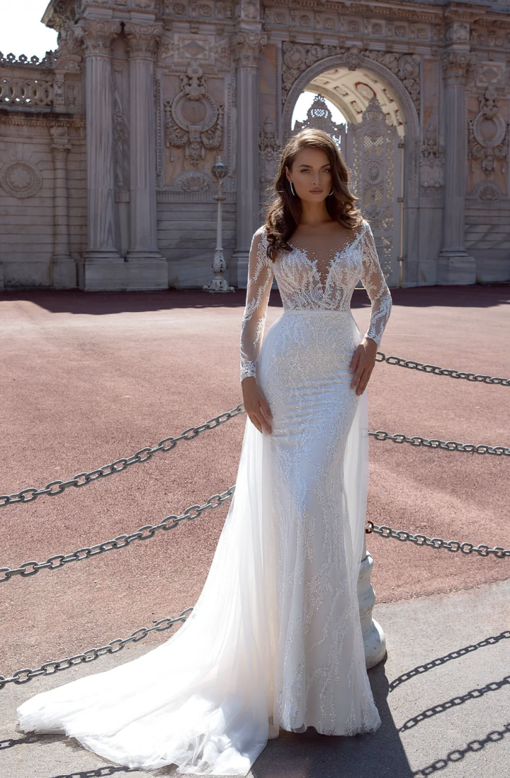 A whisper of romance, a vision of refined grace—The Elsinara Gown exudes ethereal enchantment with every detail. This mesmerizing sheath silhouette is adorned with intricate beadwork and delicate embroidery that glistens like morning dew on lace foliage. The illusion bodice and sleeves, embellished with shimmering vine-like motifs, create a dreamy, second-skin effect that captures both delicacy and drama. A soft, sweeping overlay cascades from the waist into a light-as-air train, adding depth and dimension to the figure-skimming silhouette beneath.