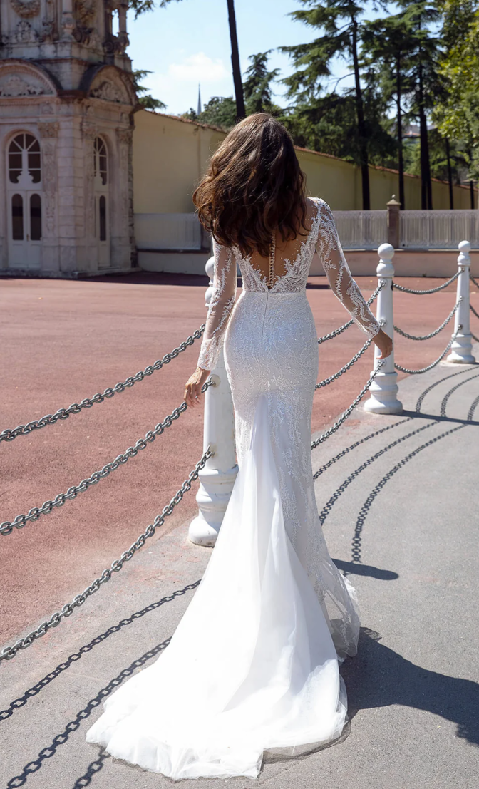 The back features a breathtaking illusion panel, intricately laced with crystalized embroidery that dances with light, making every step a statement of elegance. Designed for the bride who dares to blend sophistication with allure, The Elsinara Gown is a masterpiece for modern romantics and timeless souls alike.