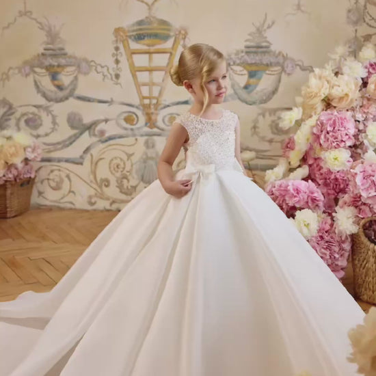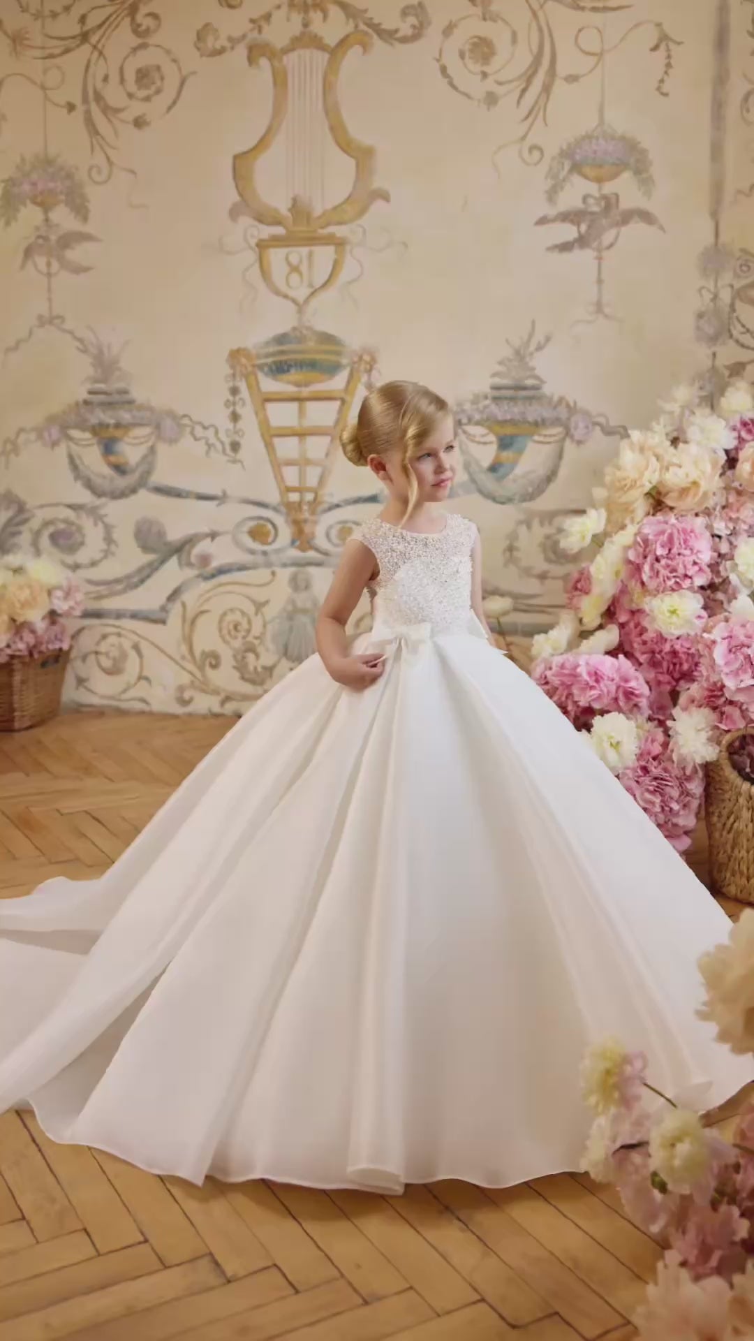 From the back, a keyhole cutout detail ensures elegance at every angle, making this gown breathtaking both entering and leaving the room. Finished with a dramatic cathedral-inspired train, the Pearl Elegance Gown ensures your little one will feel like royalty at communions, weddings, pageants, and all grand celebrations.