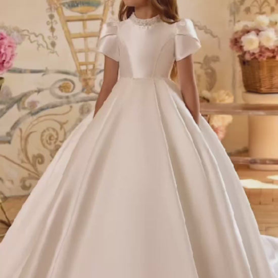 Step into timeless elegance with the Seraphina Pearl Bow Gown, a masterpiece designed for your little one’s most cherished moments. Crafted from lustrous satin, this gown captures a regal silhouette with its voluminous skirt that flows into a graceful train.
