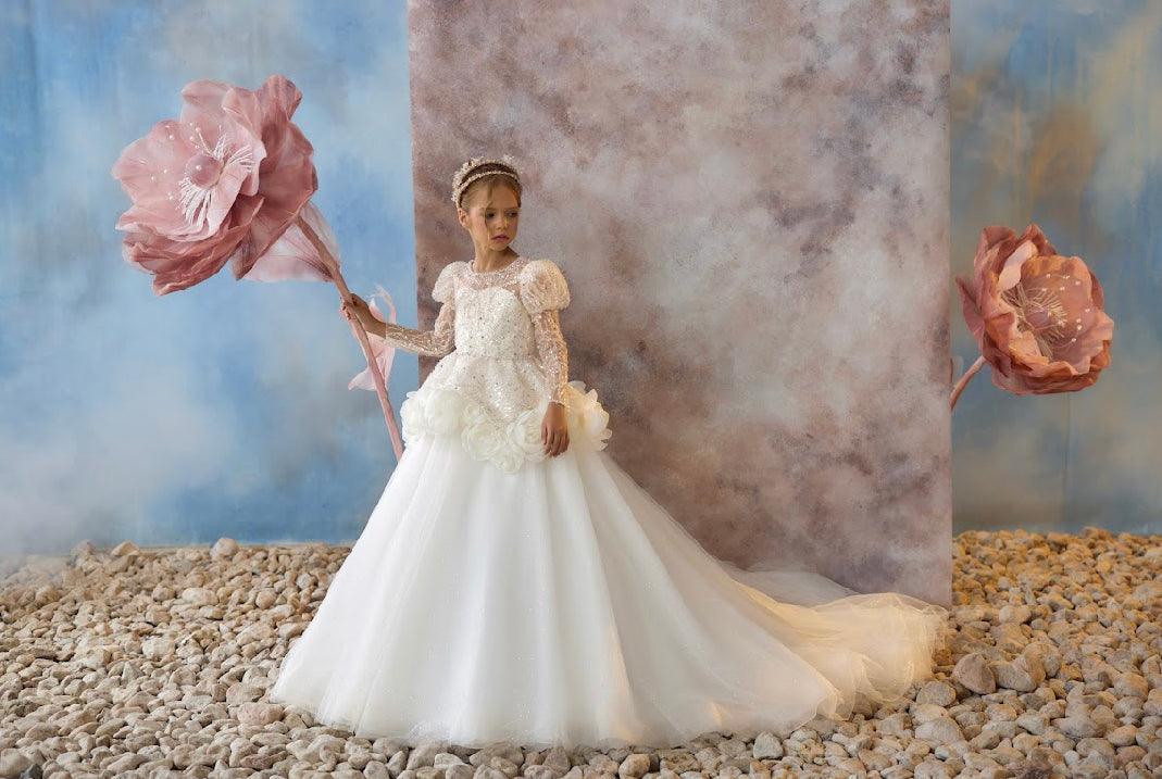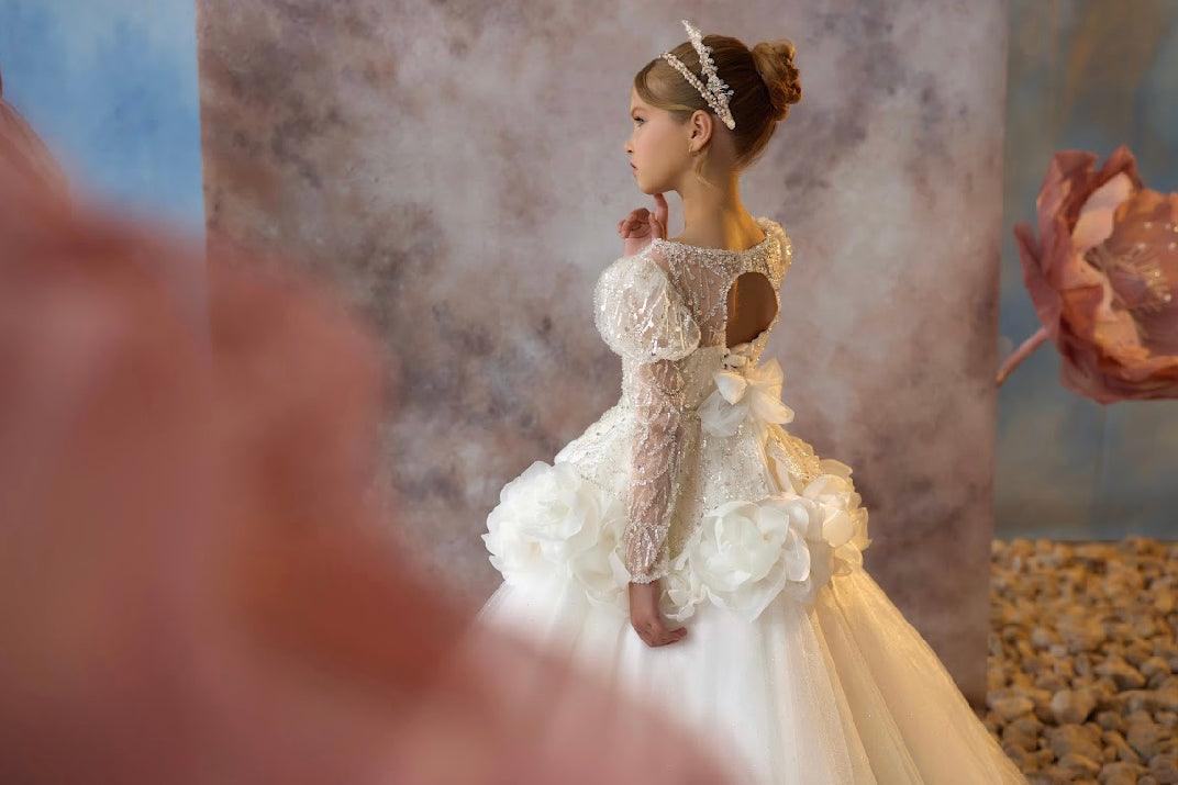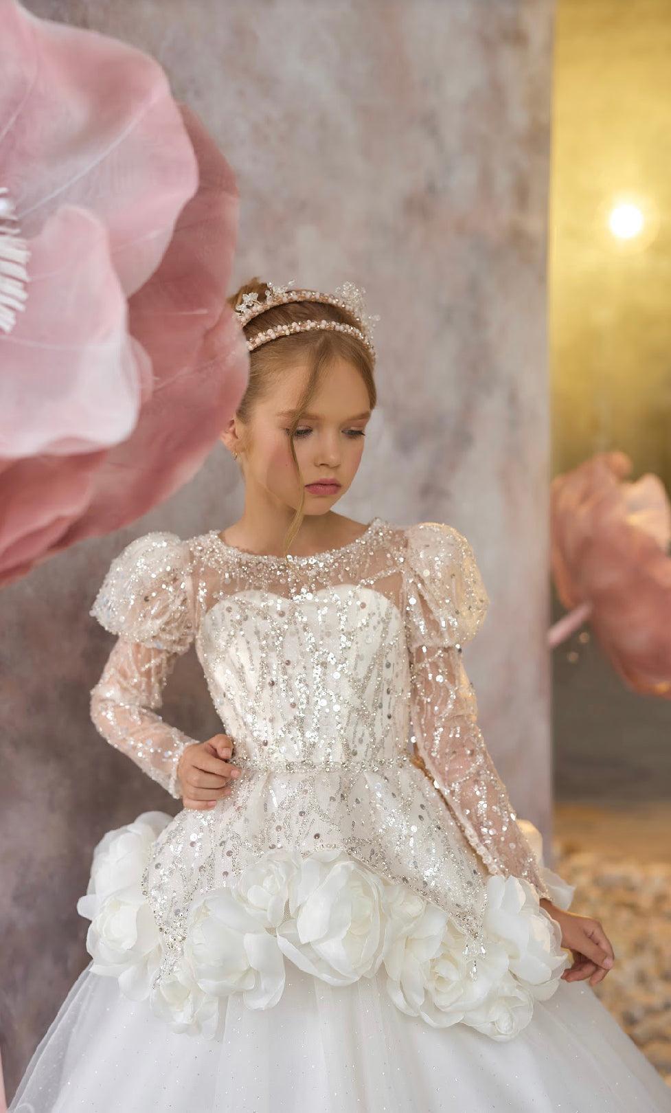 Step into a world of enchantment with this breathtaking floral princess gown, perfect for any special occasion. Crafted from luxurious layers of soft tulle, this dress features an exquisite A-line silhouette adorned with intricate floral embroidery along the neckline, shoulders, and cascading down the skirt. The delicate pastel hues, paired with the dainty flower appliqués, give this dress a fairytale-like charm that will make any girl feel like a true princess.