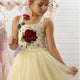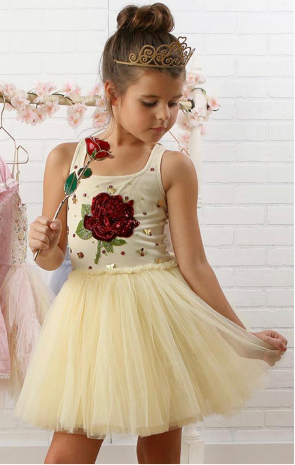 Capture the magic of a timeless tale with our Belle’s Enchanted Rose Tutu Dress. This enchanting dress features a beautifully embroidered red rose on the bodice, embellished with sparkling sequins and gold accents that bring the iconic flower to life. The soft, golden-yellow tulle skirt adds an elegant and fairy-tale-like touch, perfect for twirling and dancing at any royal event.