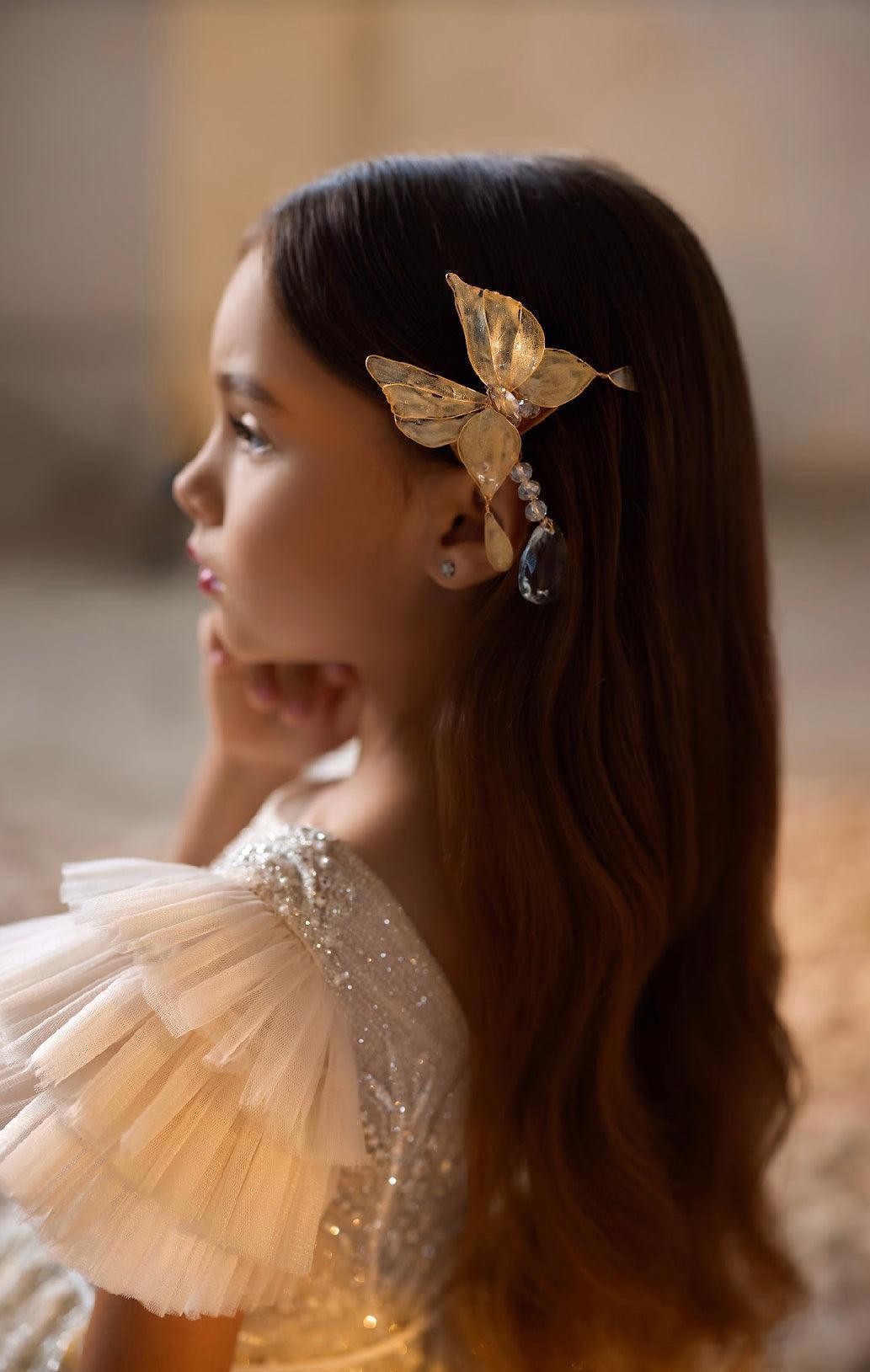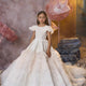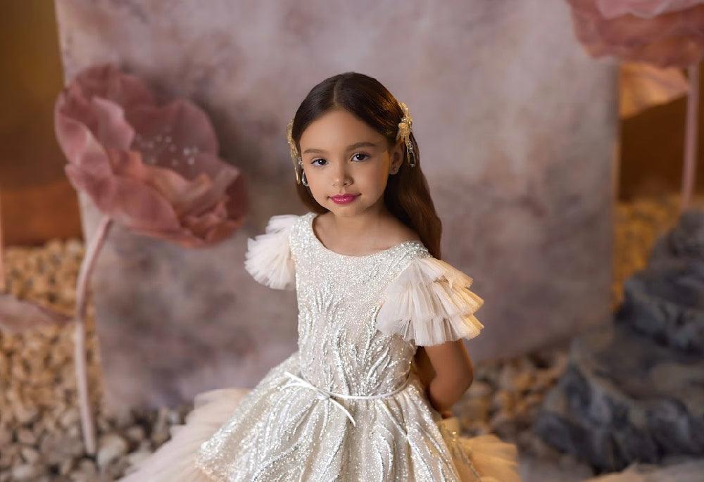 - Sleeves & Neckline: The gown features charming cap sleeves made from soft tulle, adding a playful yet elegant touch. The neckline is a simple, rounded shape that complements the gown’s sophisticated design, ensuring that the focus remains on the intricate details and luxurious fabric.