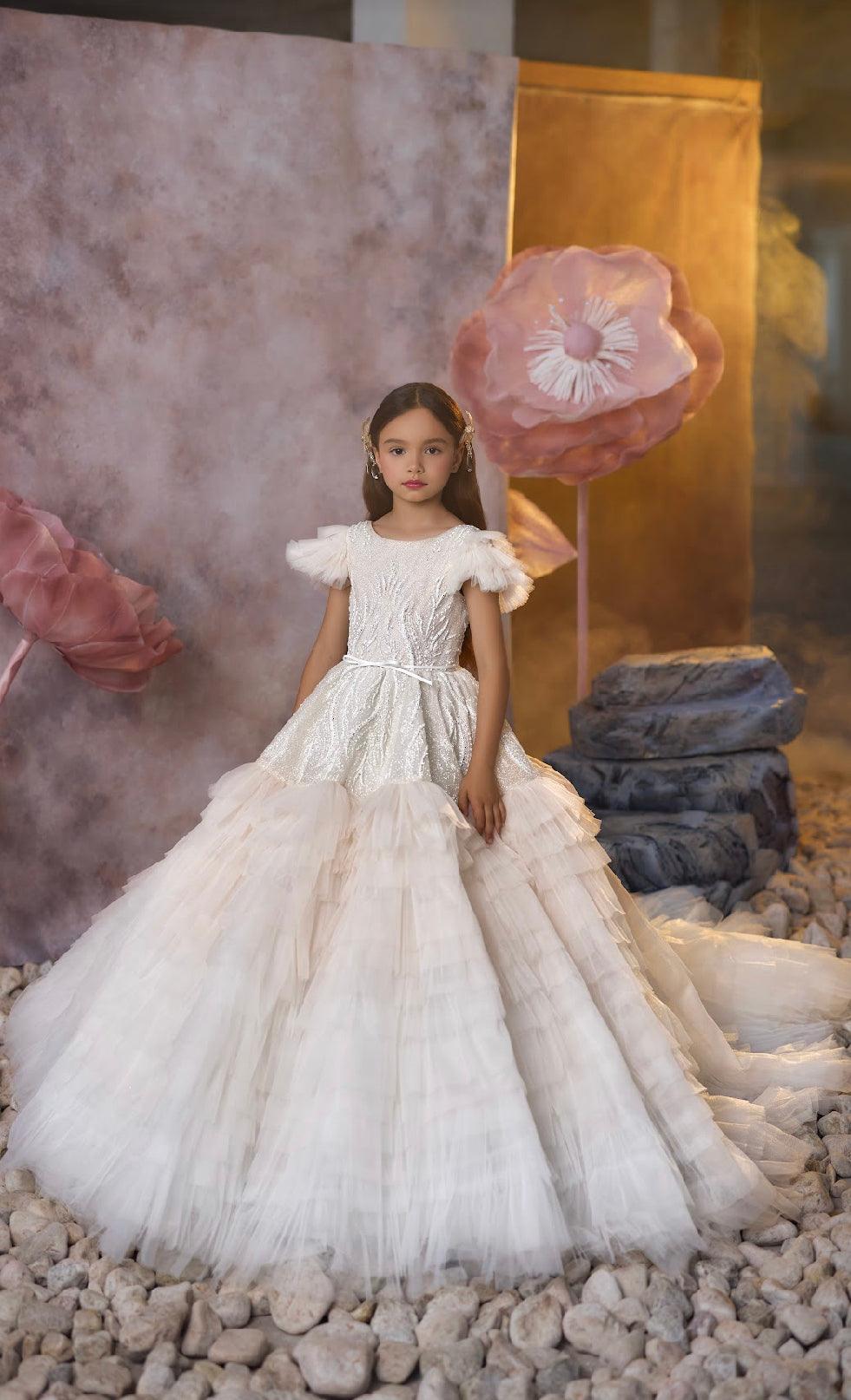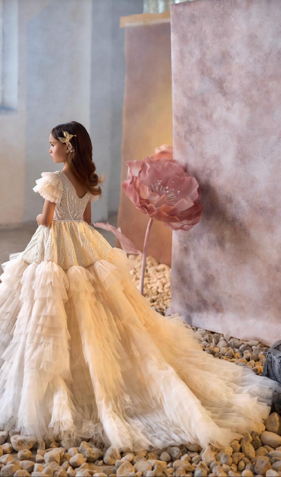 - Skirt & Train: The full, tiered skirt flows into a cascading train, creating a breathtaking visual effect with every step. The layers of tulle add volume and movement, making this gown ideal for twirling and creating unforgettable moments.