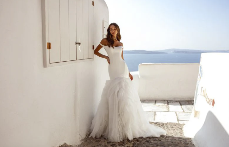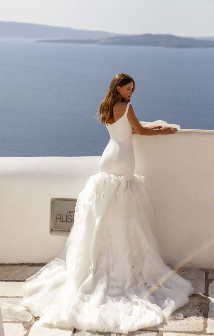 Pair this gown with crystal drop earrings, a sleek low chignon, and a cathedral-length veil for a look that radiates red carpet elegance. Perfect for sunset ceremonies, oceanfront vows, or a grand ballroom affair.