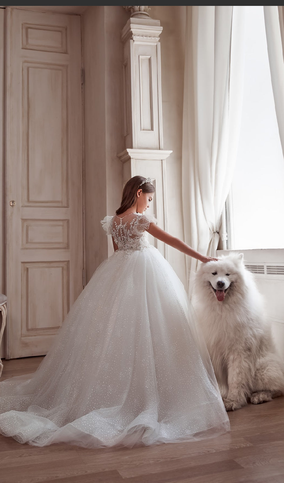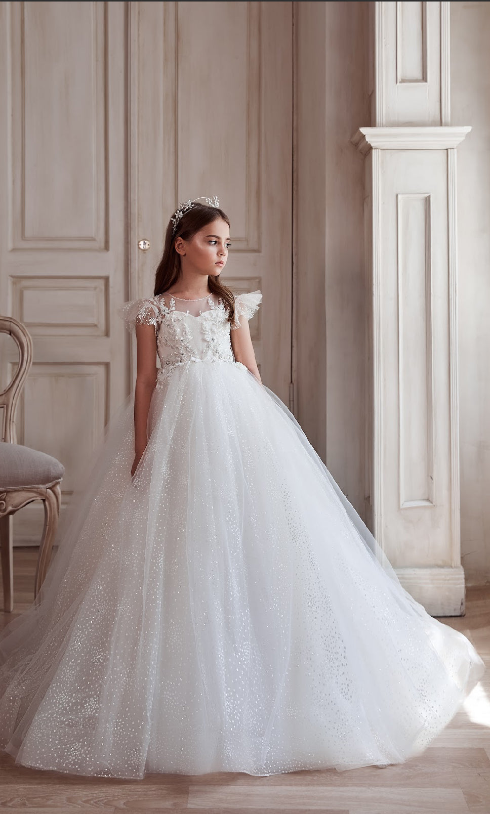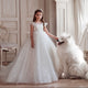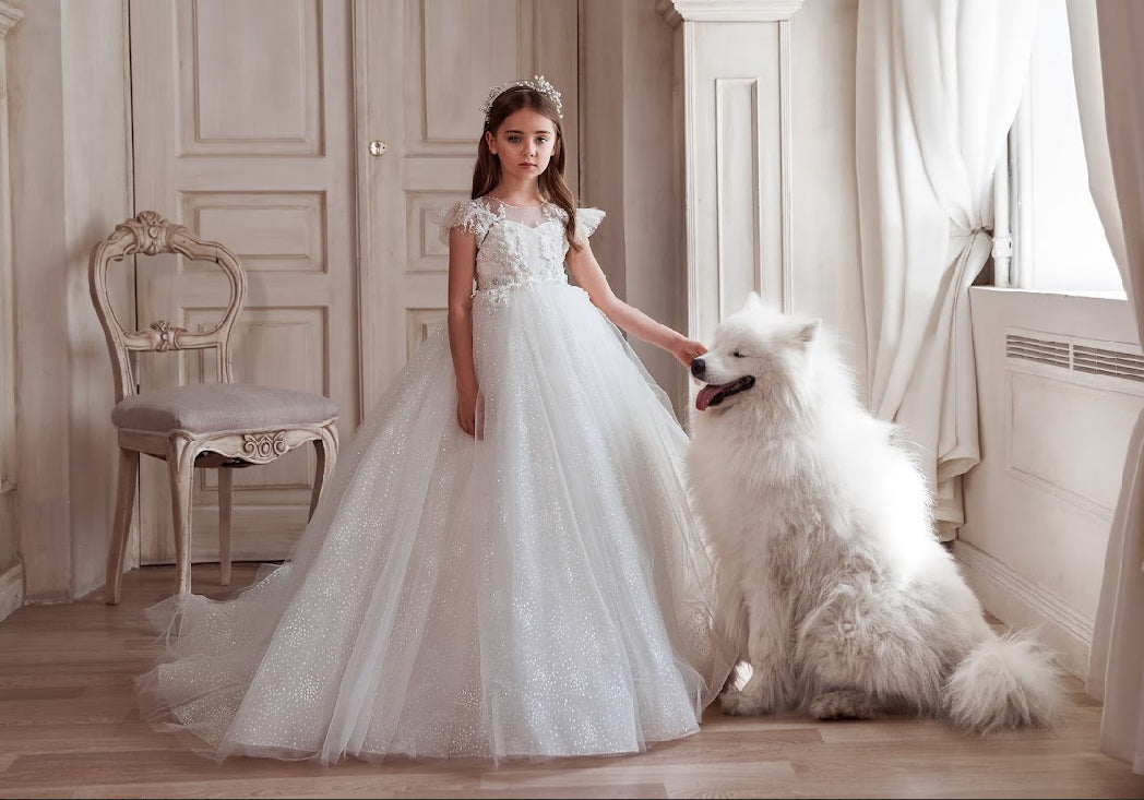 Celestial Radiance Ball Gown, a masterpiece of elegance and grace. Featuring a delicate bodice adorned with shimmering floral appliqués and a sheer illusion neckline, this gown exudes timeless beauty. The sparkling tulle skirt cascades into a breathtaking train, creating a fairy-tale silhouette perfect for communions, flower girl moments, or any grand celebration.