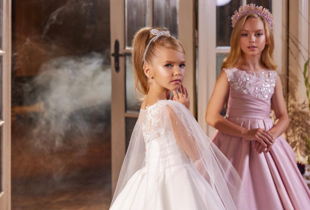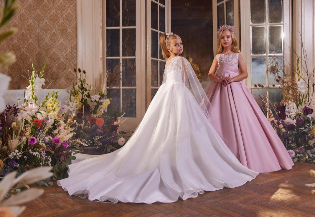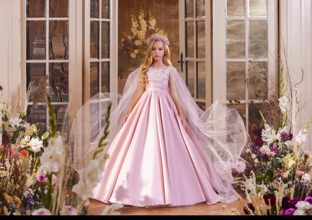 Introducing the Empress Gown Collection, a celebration of elegance, grace, and timeless beauty. These exquisite gowns, available in both white and blush pink, are designed to make your little princess shine at any special occasion. The white gown features an ethereal full-length skirt with a delicate lace bodice and cape-like sleeves, perfect for creating a magical, regal look. The blush pink gown is equally stunning, with intricate floral details on the bodice and a voluminous skirt, adding a touch of royal sophistication.