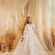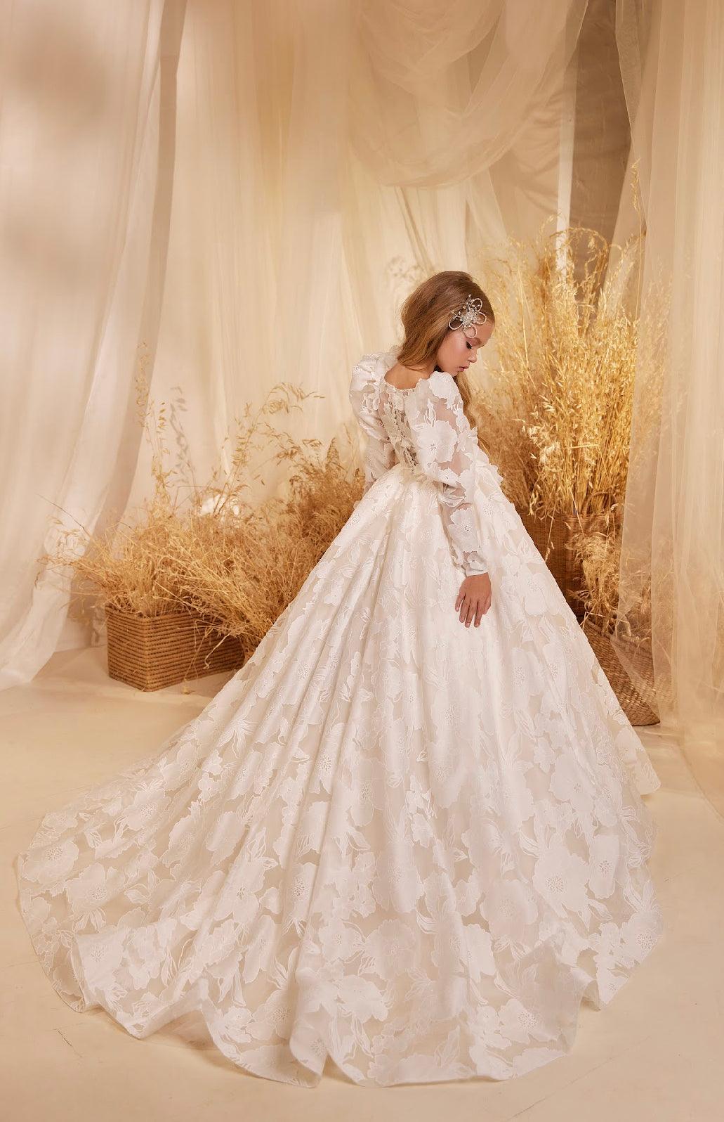 The neckline showcases a gentle round cut, which is beautifully complemented by sheer, voluminous sleeves, giving the dress an enchanting princess silhouette.