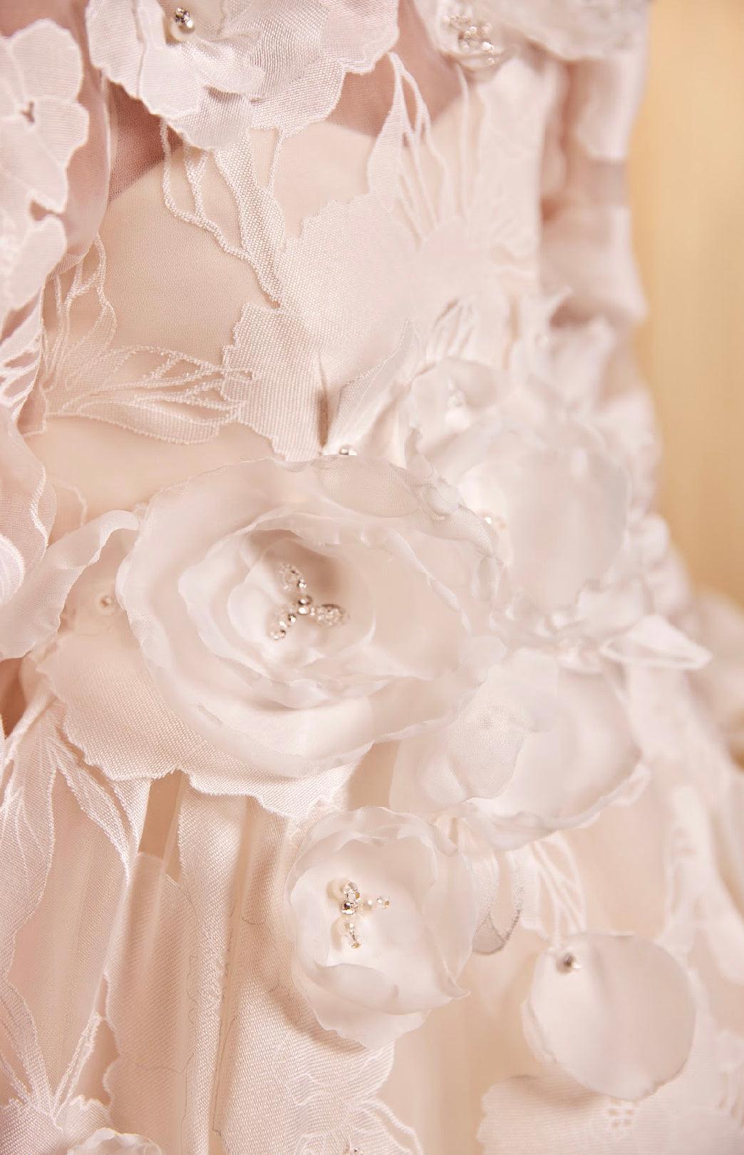 Beautiful three-dimensional floral appliqués are scattered across the dress. These appliqués, detailed with tiny sparkling accents, shimmer when they catch the light. Each appliqué is meticulously arranged, with larger ones placed at the waist and smaller, more delicate ones dispersed around the neck, sleeves, and skirt.